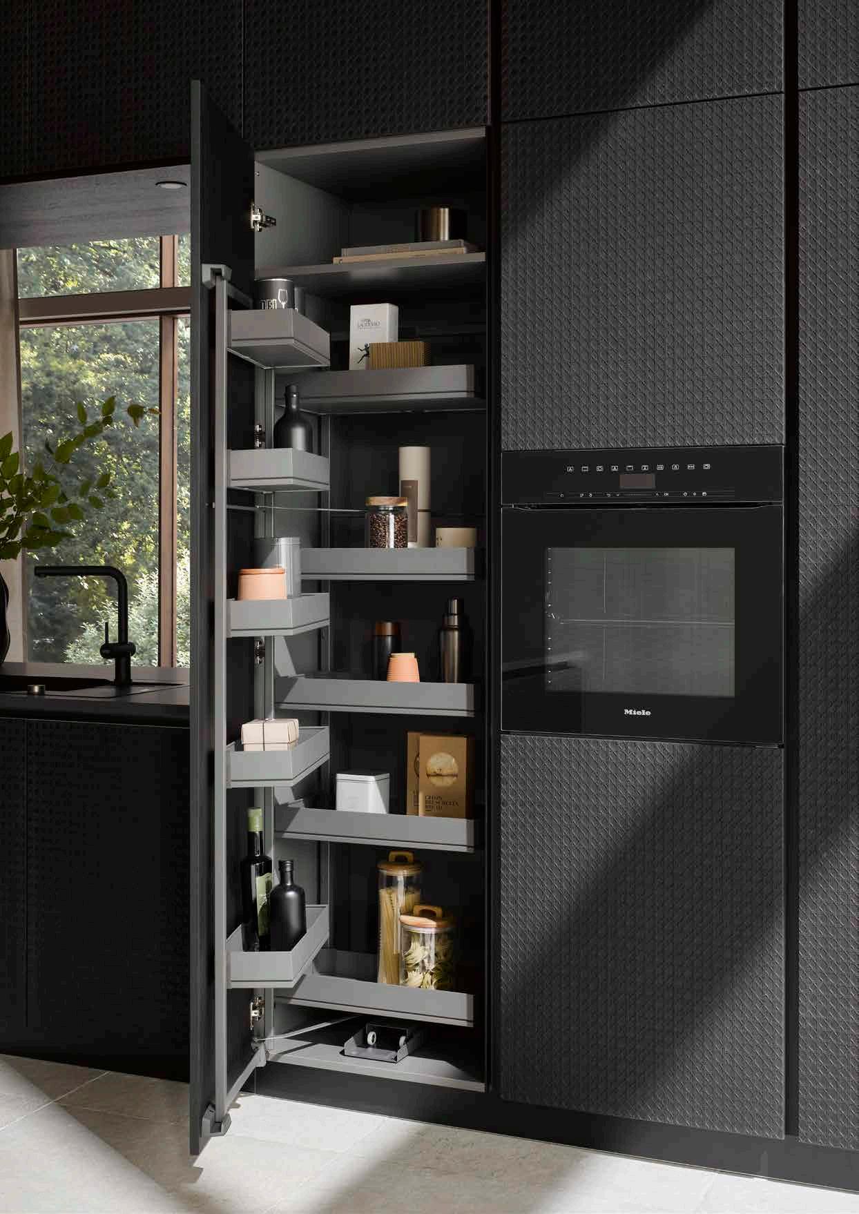 The tandem swivel pull-out in the high cupboard combines optimum handling with perfect aesthetics. With an elegant surface and seamless mechanism, it not only offers maximum storage space, but also an exclusive experience. The highquality coating gives the pull-out unit a timeless elegance, while the designer carcase in titanium is a stylish addition to any modern kitchen.