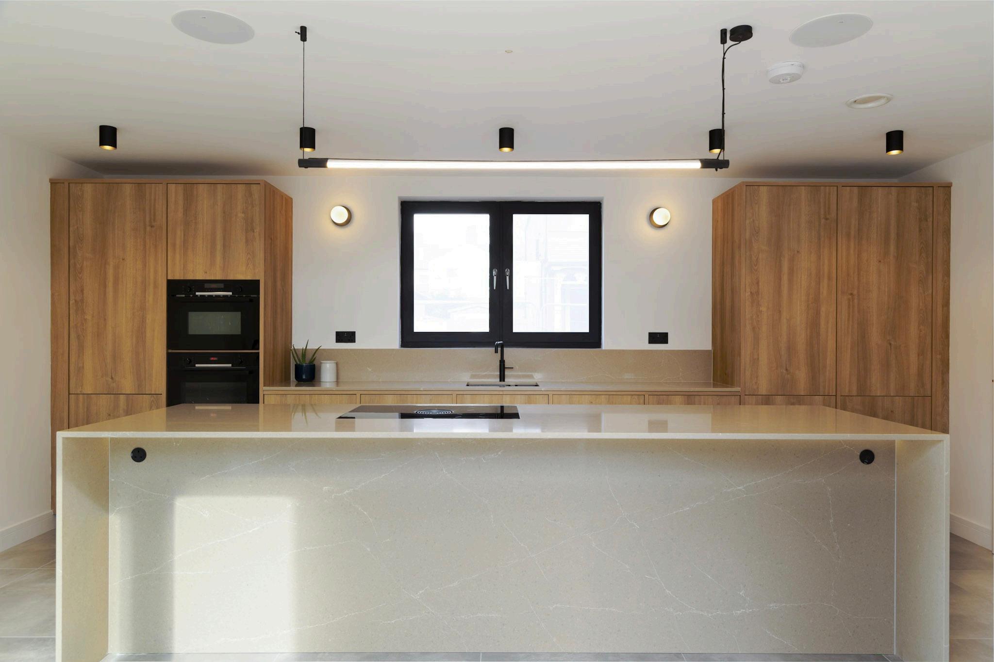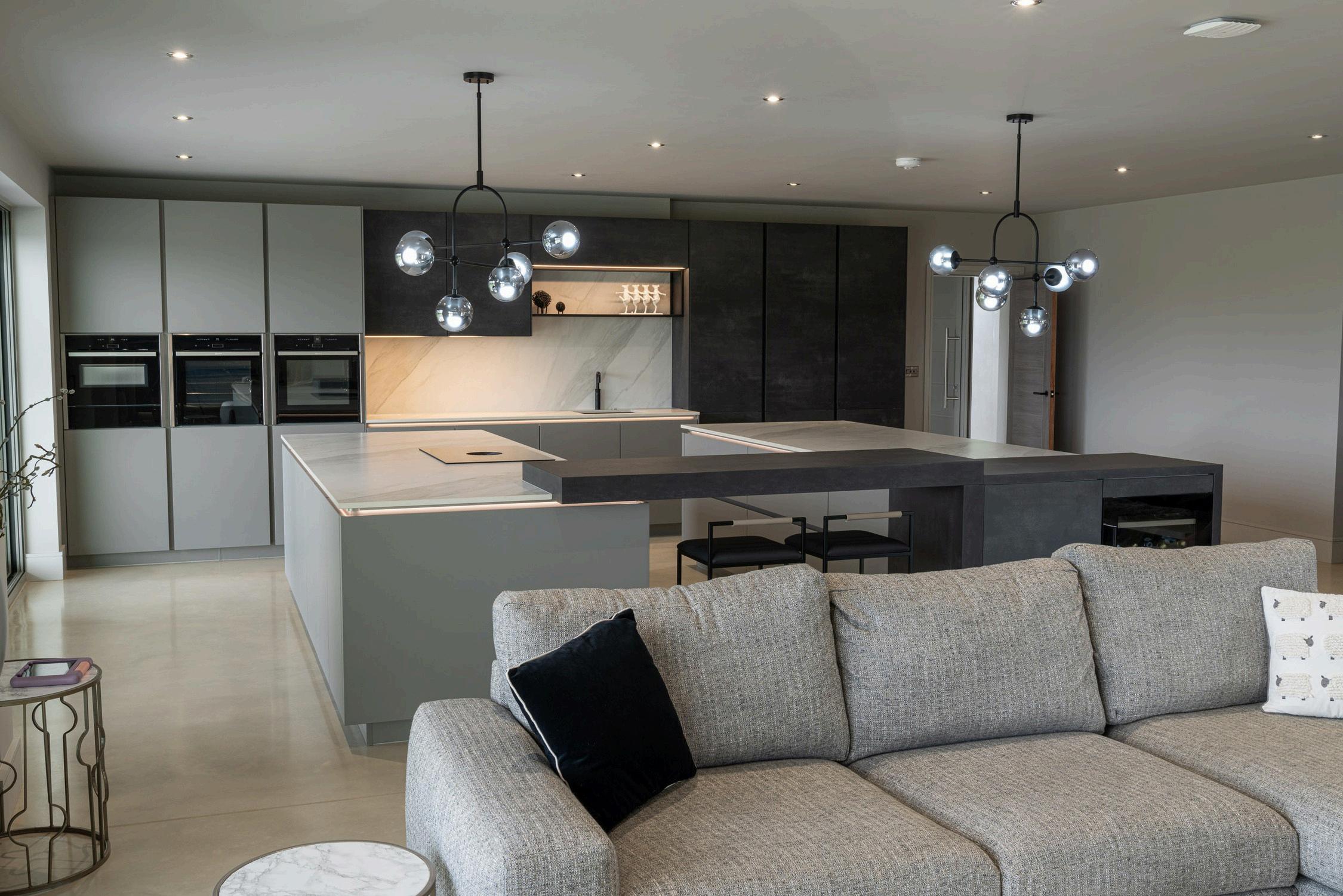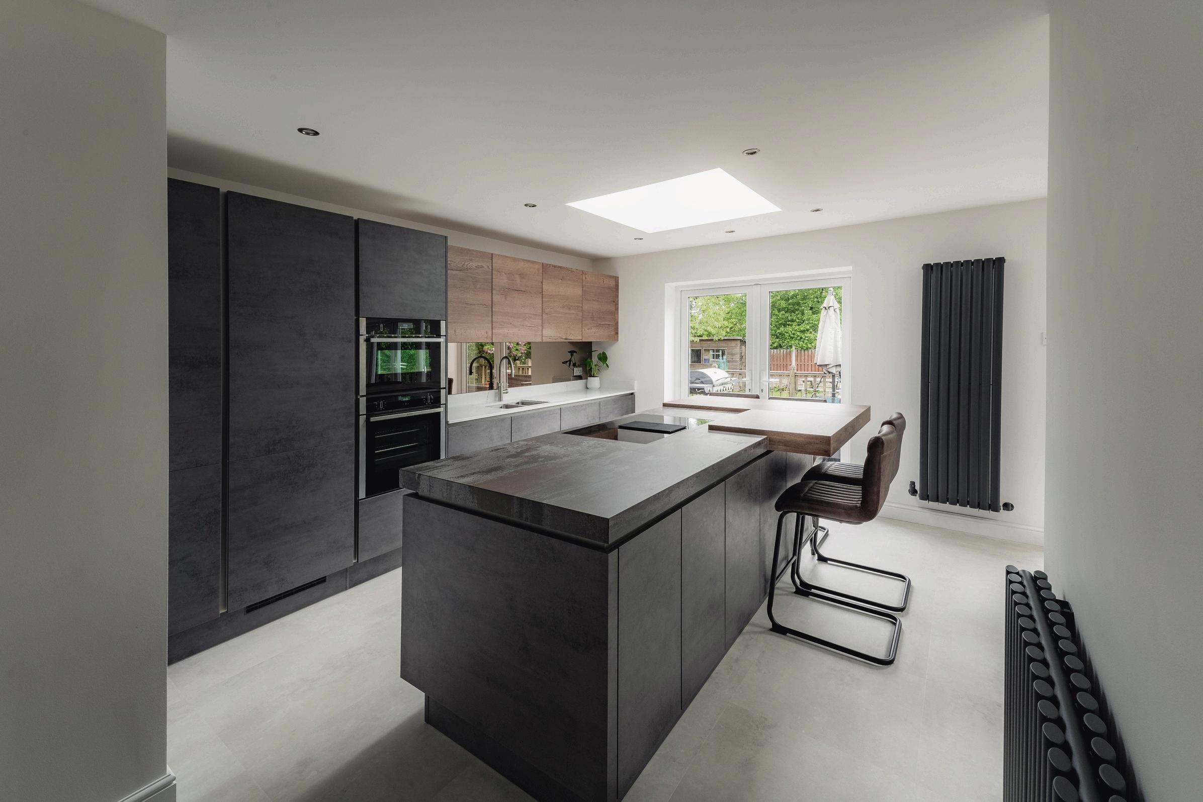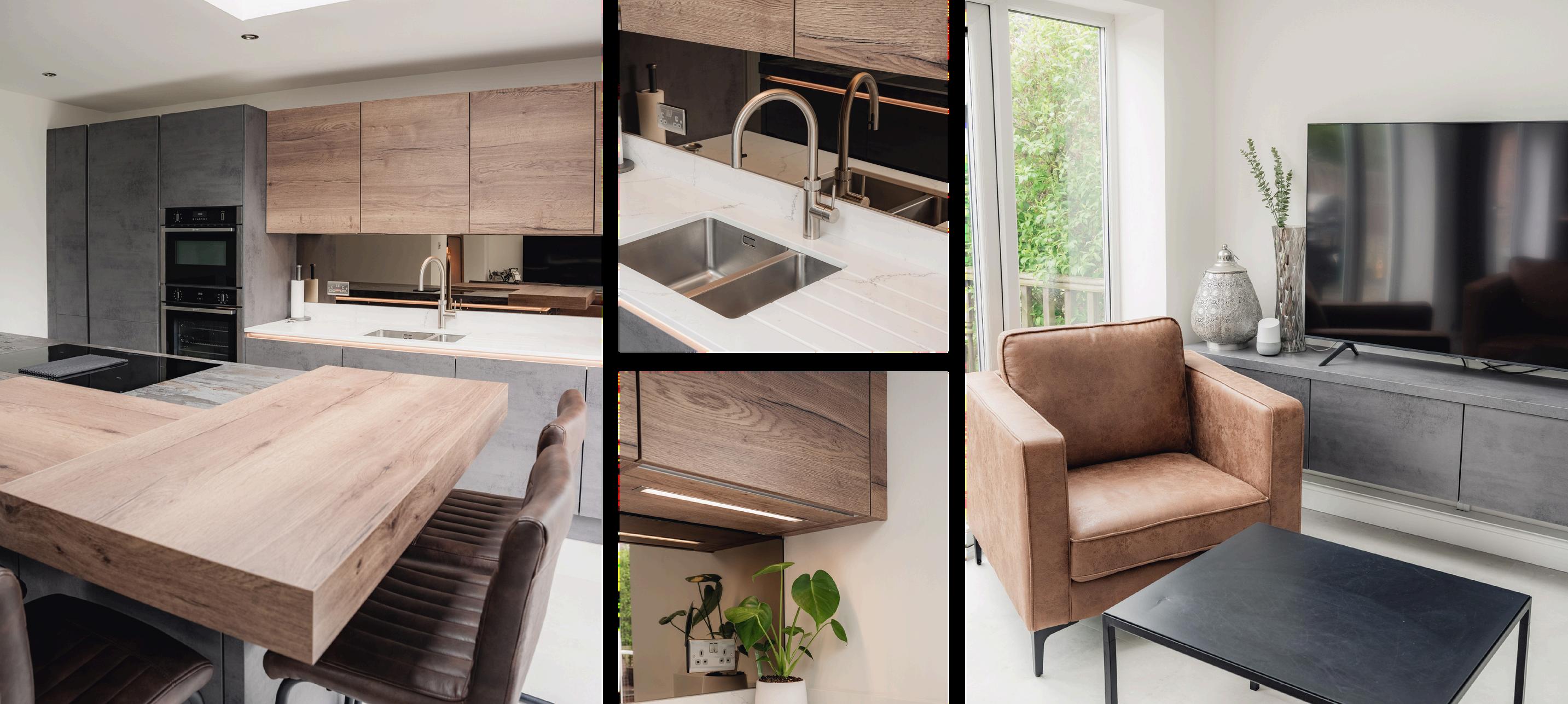 A Nobilia kitchen supplied and fitted in Dark Concrete laminate with contrasting Havana Oak wall cabinets to add warmth. Handless fronts and wall units feature integrated warm lighting, with a 20mm Smokey Marble worktop on the sink run and a Trillium 90mm island with a 100mm Havana Oak breakfast bar for entertaining. A media wall ties both areas of the house together, while Neff N70 appliances, an Elica downdraft hob, Quooker Flex tap, and an Antique Brass glass splashback complete the industrial-inspired design.
