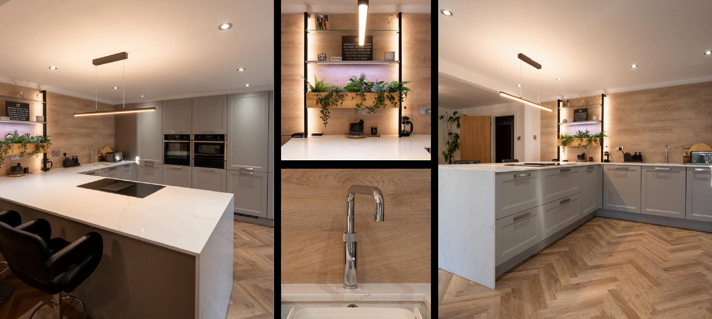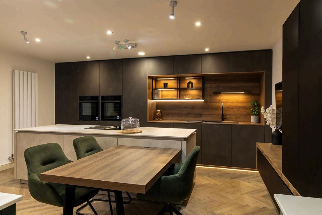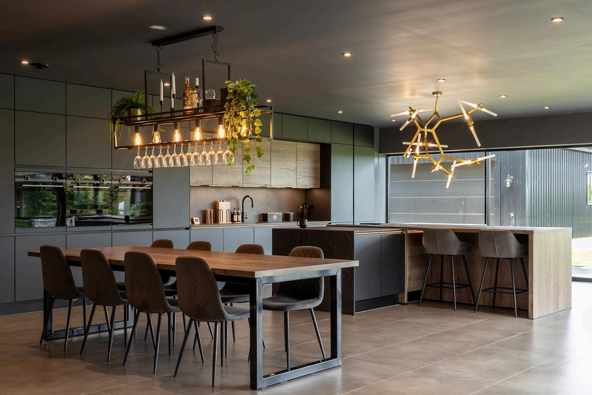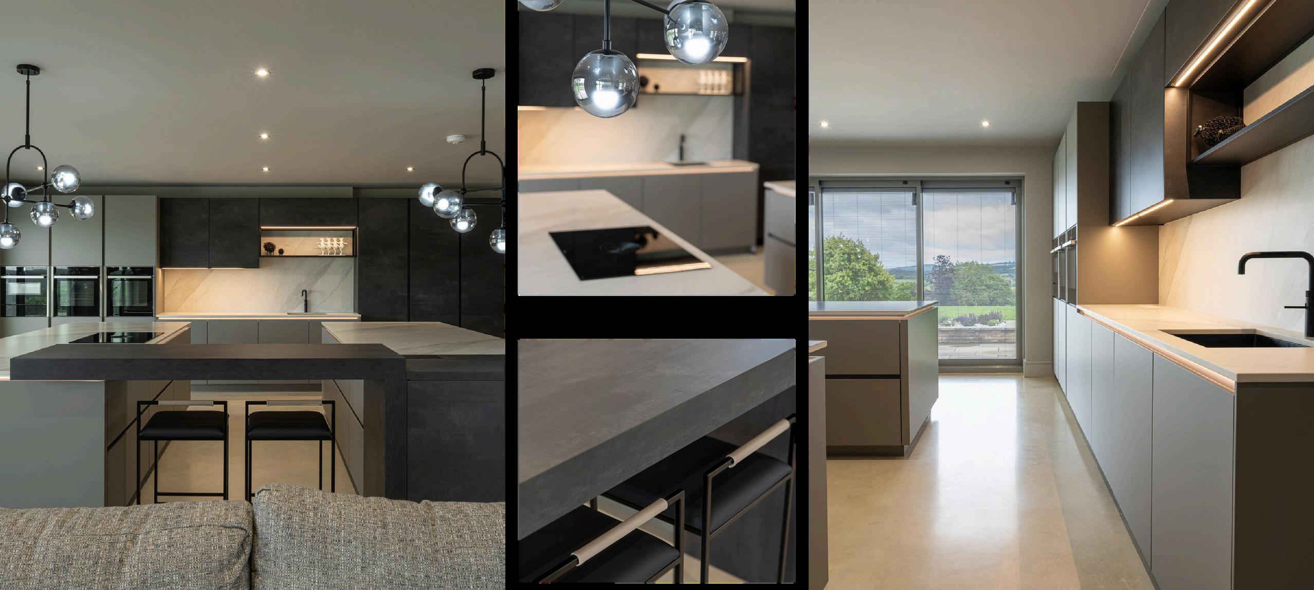A Nobilia kitchen supplied and fitted in Dark Concrete laminate with contrasting Havana Oak wall cabinets to add warmth. Handless fronts and wall units feature integrated warm lighting, with a 20mm Smokey Marble worktop on the sink run and a Trillium 90mm island with a 100mm Havana Oak breakfast bar for entertaining. A media wall ties both areas of the house together, while Neff N70 appliances, an Elica downdraft hob, Quooker Flex tap, and an Antique Brass glass splashback complete the industrial-inspired design.