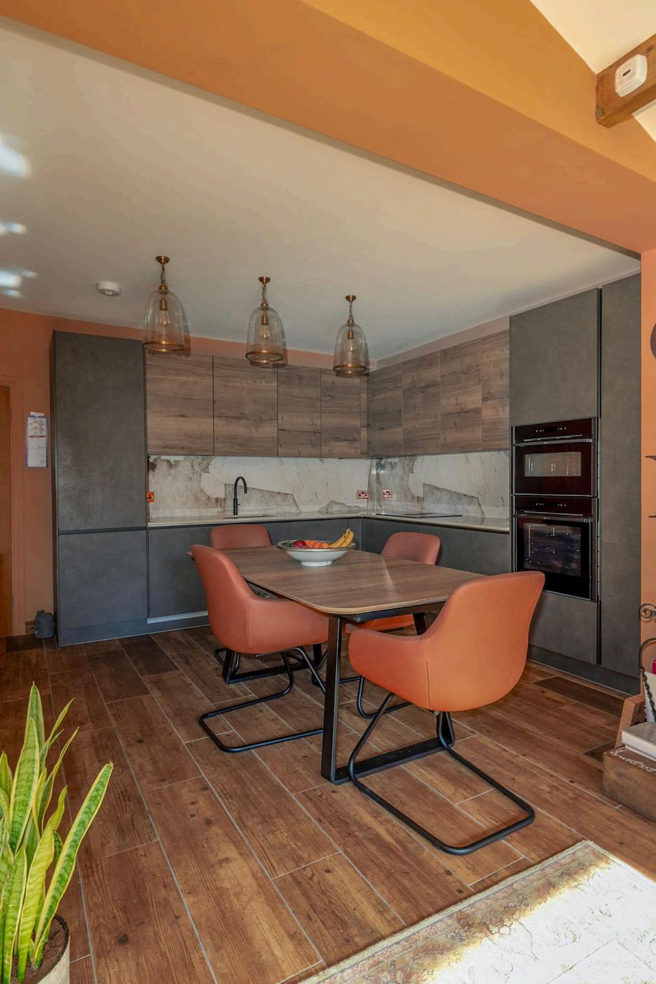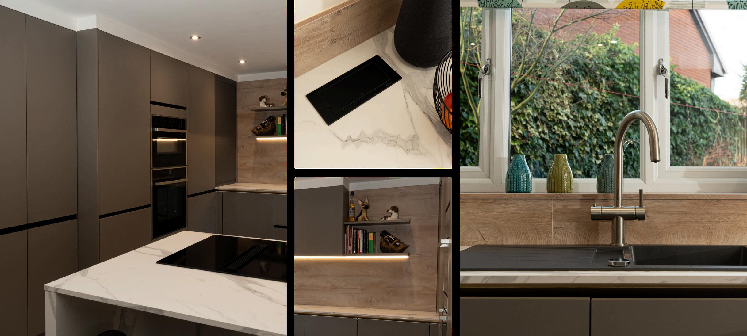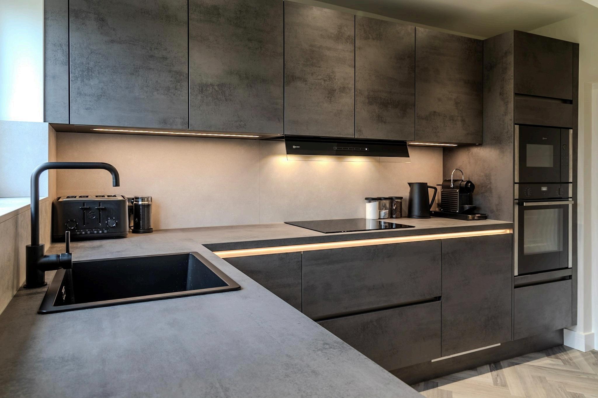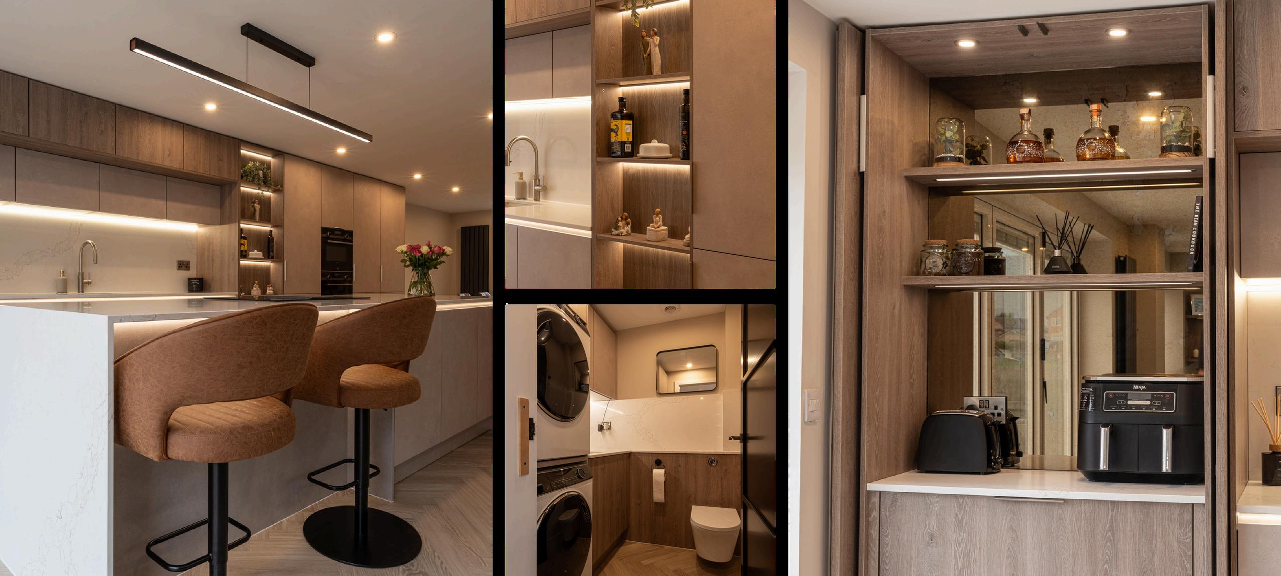 A Nobilia kitchen supplied and fitted in Dark Concrete laminate with contrasting Havana Oak wall cabinets to add warmth. Handless fronts and wall units feature integrated warm lighting, with a 20mm Smokey Marble worktop on the sink run and a Trillium 90mm island with a 100mm Havana Oak breakfast bar for entertaining. A media wall ties both areas of the house together, while Neff N70 appliances, an Elica downdraft hob, Quooker Flex tap, and an Antique Brass glass splashback complete the industrial-inspired design.