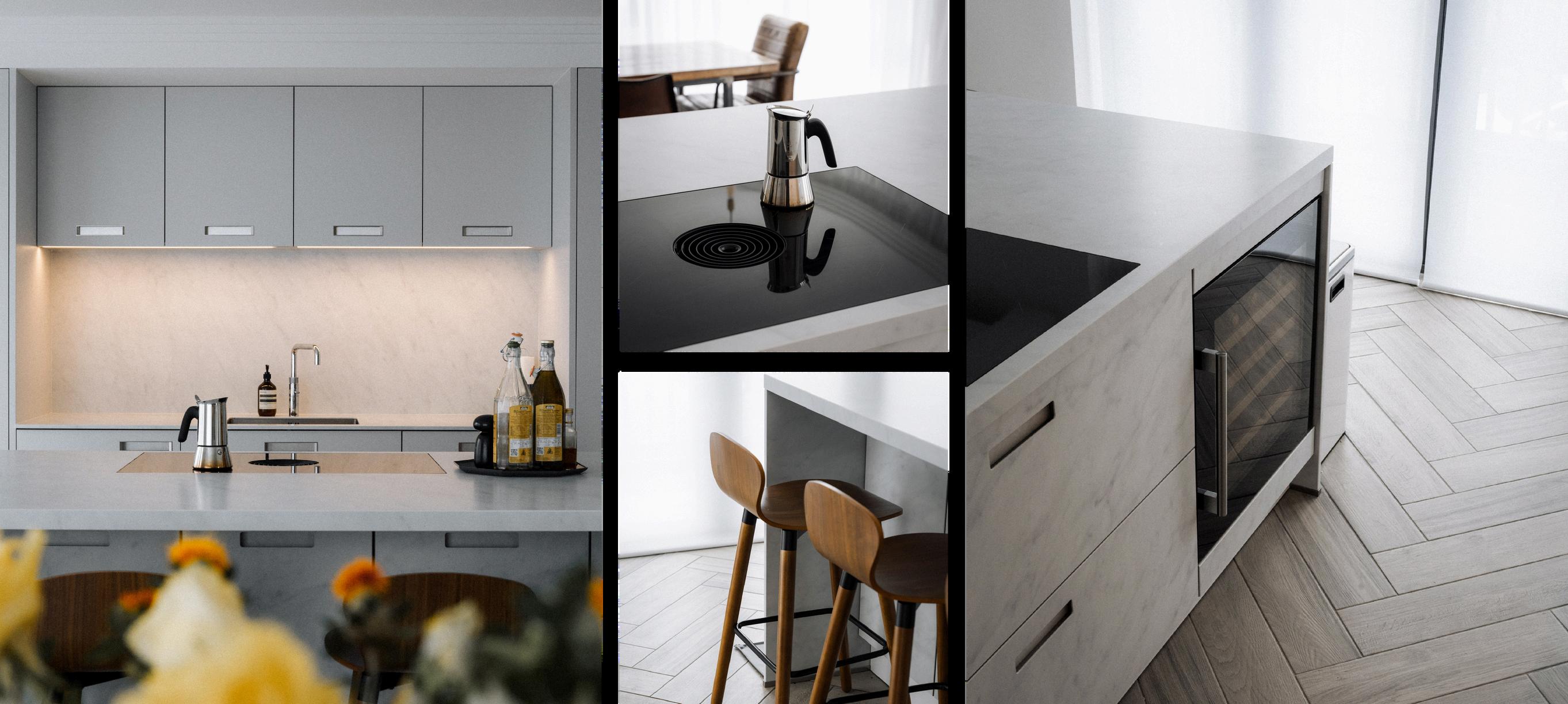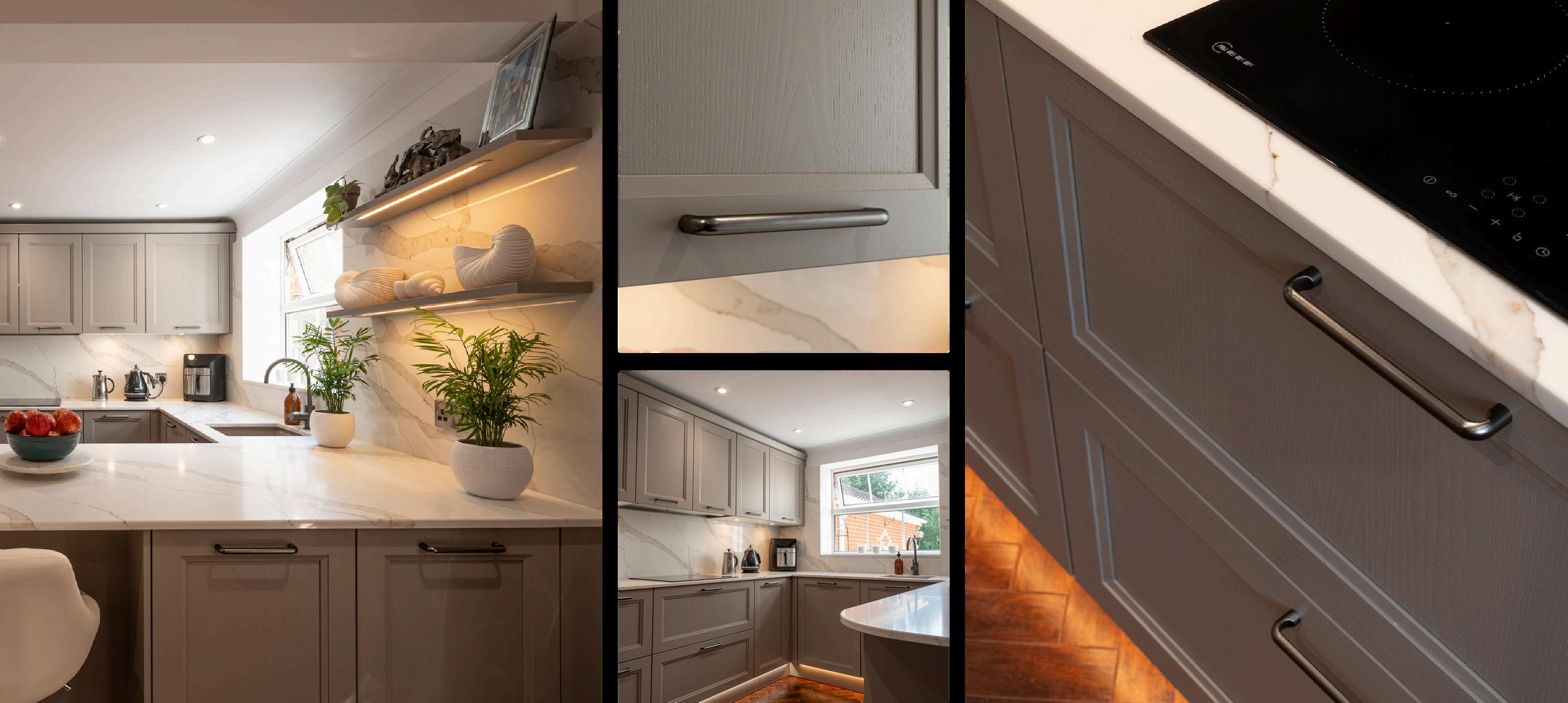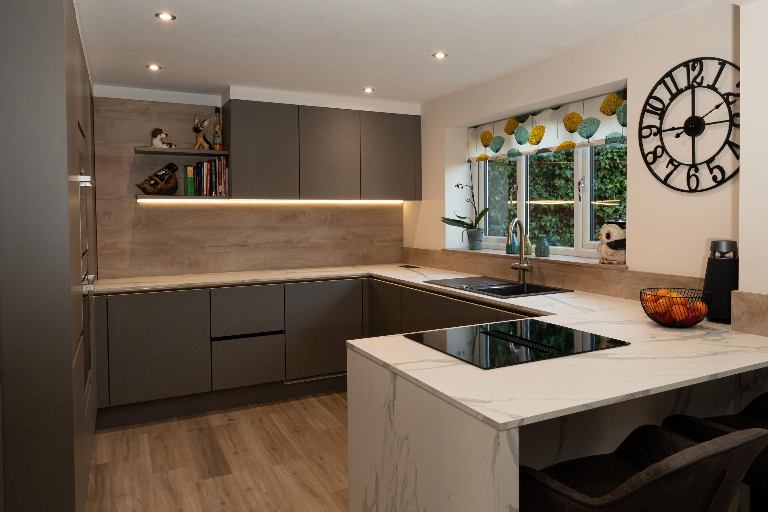 A Schüller kitchen featuring Agate Grey shaker doors with titanium handles and 20mm Calacatta solid worktops. Designed in a U-shaped layout with a worktop overhang for breakfast bar seating, it includes integrated shelving and plinth lighting, full Siemens appliances, and was fully supplied, prepared, and installed by our team.
