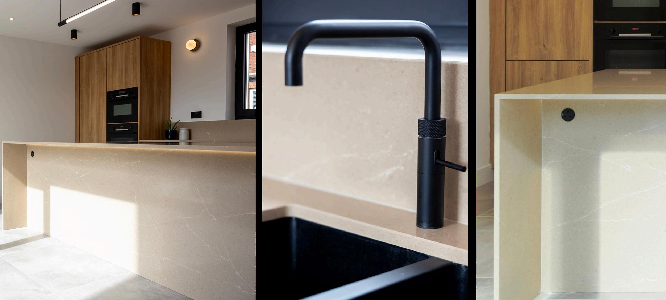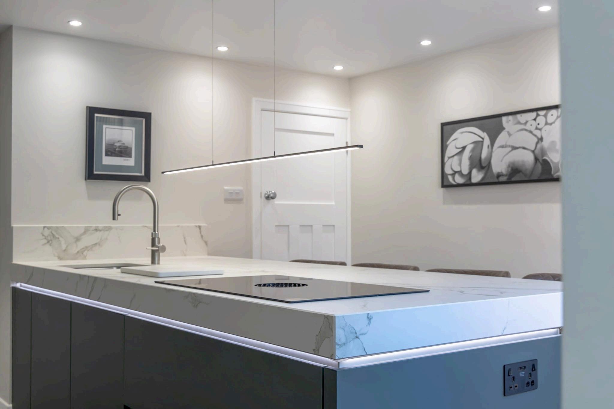 A Schüller kitchen featuring Sand and Targa Steel handless fronts with 20mm Smokey Marble worktops. Wall units have integrated lighting, while a large island provides a sociable hub for family life. It includes Neff appliances, a downdraft hob, and Quooker tap, designed to complement the new extension