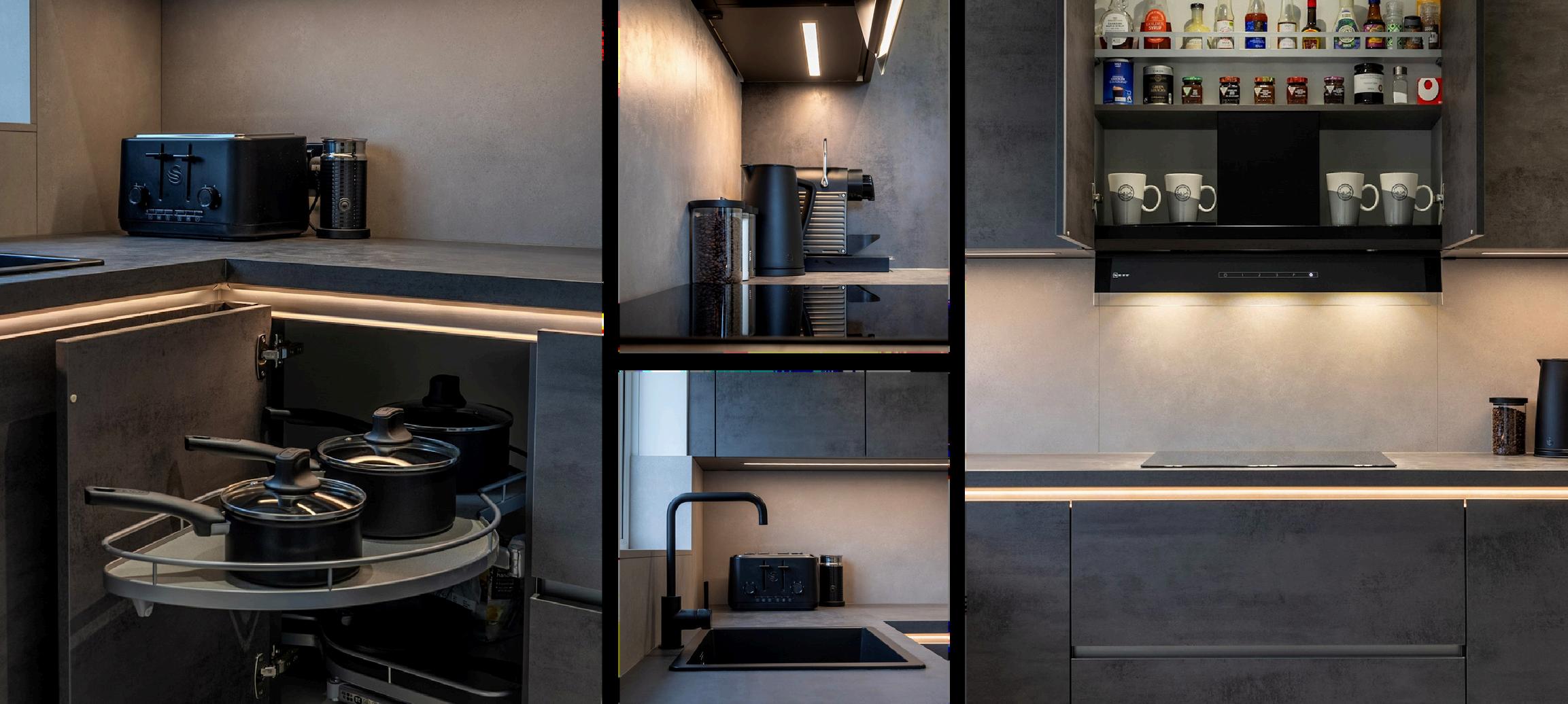 A Nobilia kitchen featuring Dark Concrete laminate with a matching Concrete Grey splashback and handless fronts with integrated appliances. Laminate worktops in the same finish provide a seamless look. Designed as a small kitchen to maximise space, it includes Le Mans units and integrated extractor units, creating practical storage for spices and everyday essentials.