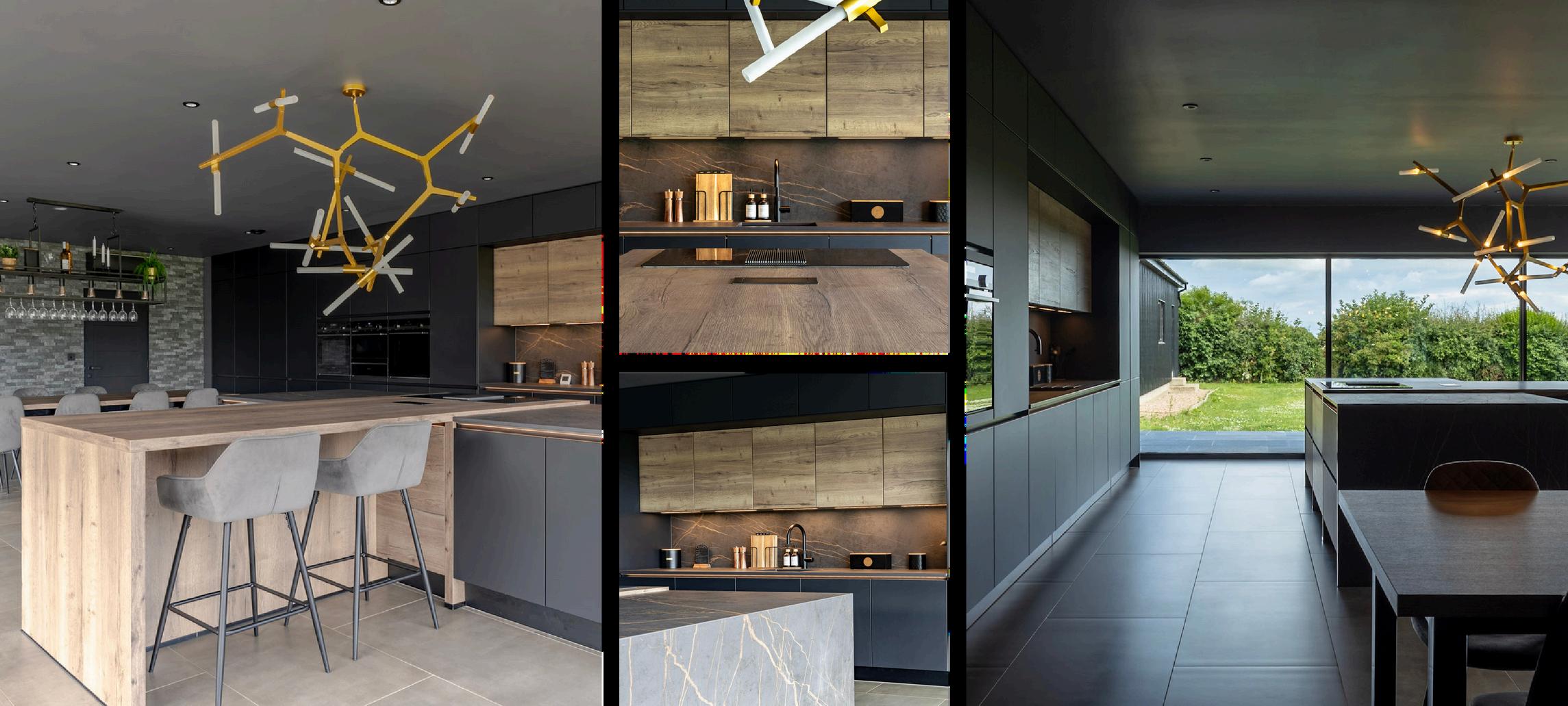 A Nobilia kitchen featuring Graphite Black lacquered laminate handless doors with black rails and integrated lighting, 20mm Dekton Laurent worktops, and a Havana Oak breakfast bar. It includes a Quooker Flex tap in matt black, integrated wall units, Siemens built-in appliances, and an Elica downdraft hob. Designed for open-plan living, the kitchen maximises storage with units above larders and integrated breakfast cabinets, combining style and practicality
