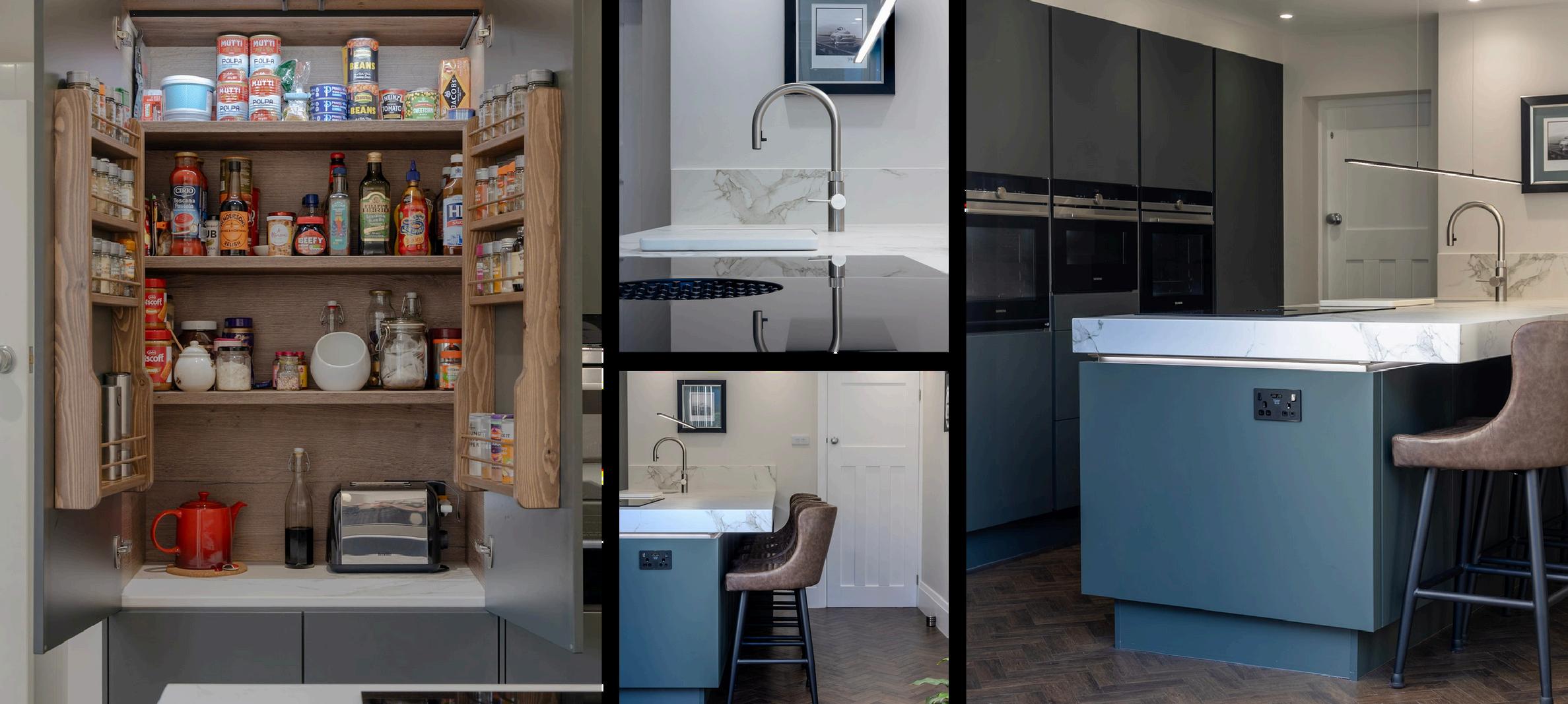 A Nobilia kitchen featuring Mineral Green lacquered laminate handless doors, with solid worktops and a 90mm Dekton-built up peninsula island. Designed with integrated pantry larders, a downdraft hob, Quooker tap on the peninsula, and all Siemens appliances, it combines practical storage with a sleek, contemporary layout.