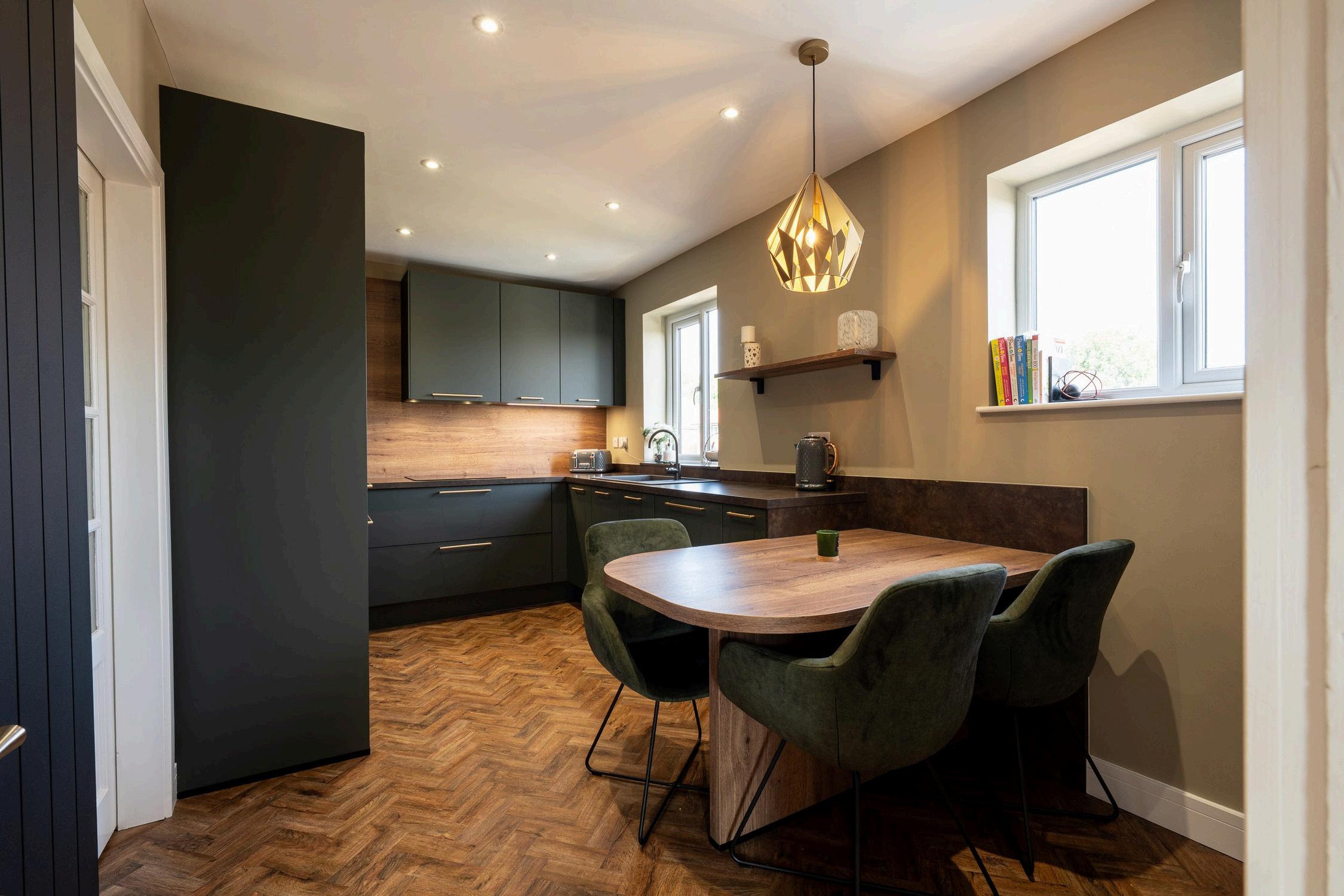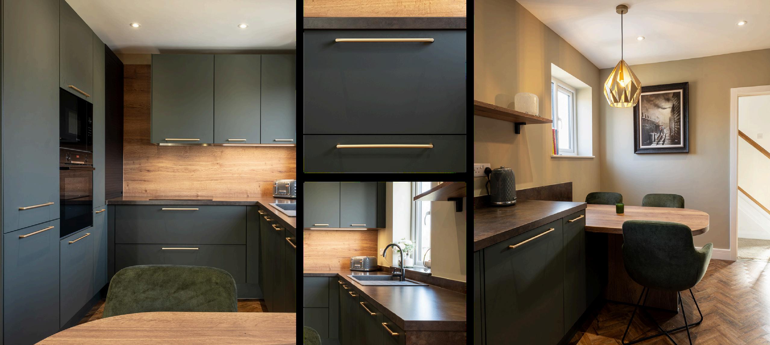 A Nobilia kitchen featuring Mineral Green lacquered laminate doors with gold handles, and laminate worktops in a copper finish with a Havana Oak splashback. Designed as a compact layout with an integrated dining table, it includes a tambour unit for the microwave, Bosch appliances, a composite sink and taps, and integrated lighting, maximising style and functionality.