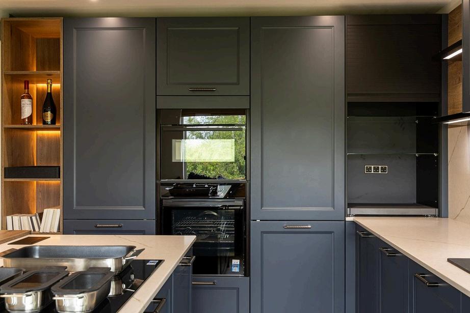 A Nobilia kitchen featuring Fjord Blue lacquered laminate handless fronts, with a 20mm Smokey Marble worktop and full-height splashback. Wall units with tinted black glass fronts feature integrated lighting, complemented by illuminated shelving, a black Quooker tap, downdraft hob, Neff appliances, and a flip socket in the island. Designed for a traditional barn conversion, the kitchen blends modern style with the character of the original space.