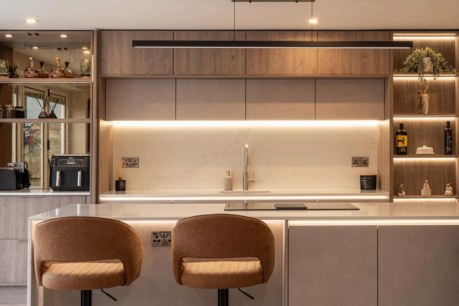 add warmth, while wall units with integrated lighting and open shelving enhance the design. A peninsula with seating for two breakfast stools provides a sociable hub, with downdraft hobs and integrated Neff appliances for practical functionality.