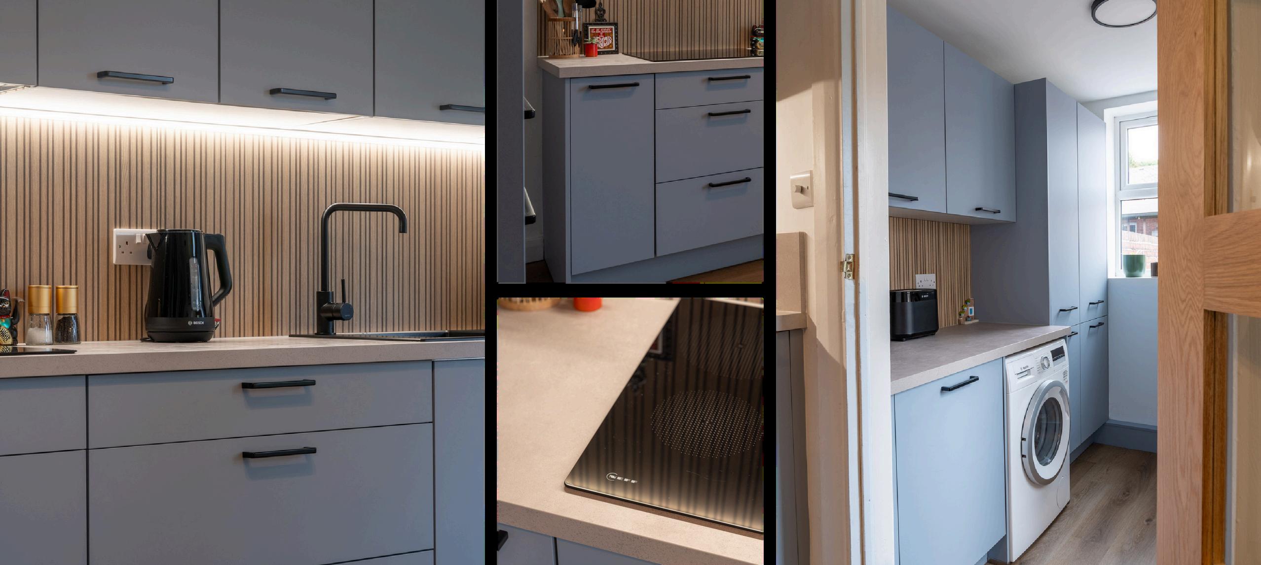 A Nobilia kitchen featuring Sky Blue lacquered laminate doors, black knurled handles, and sand concrete laminate worktops. Designed with a decorative wooden slatted splashback, it incorporates all Neff appliances and an off-shot utility, creating a layout that opens the kitchen to an open-plan dining area while maximising space in this terraced home.
