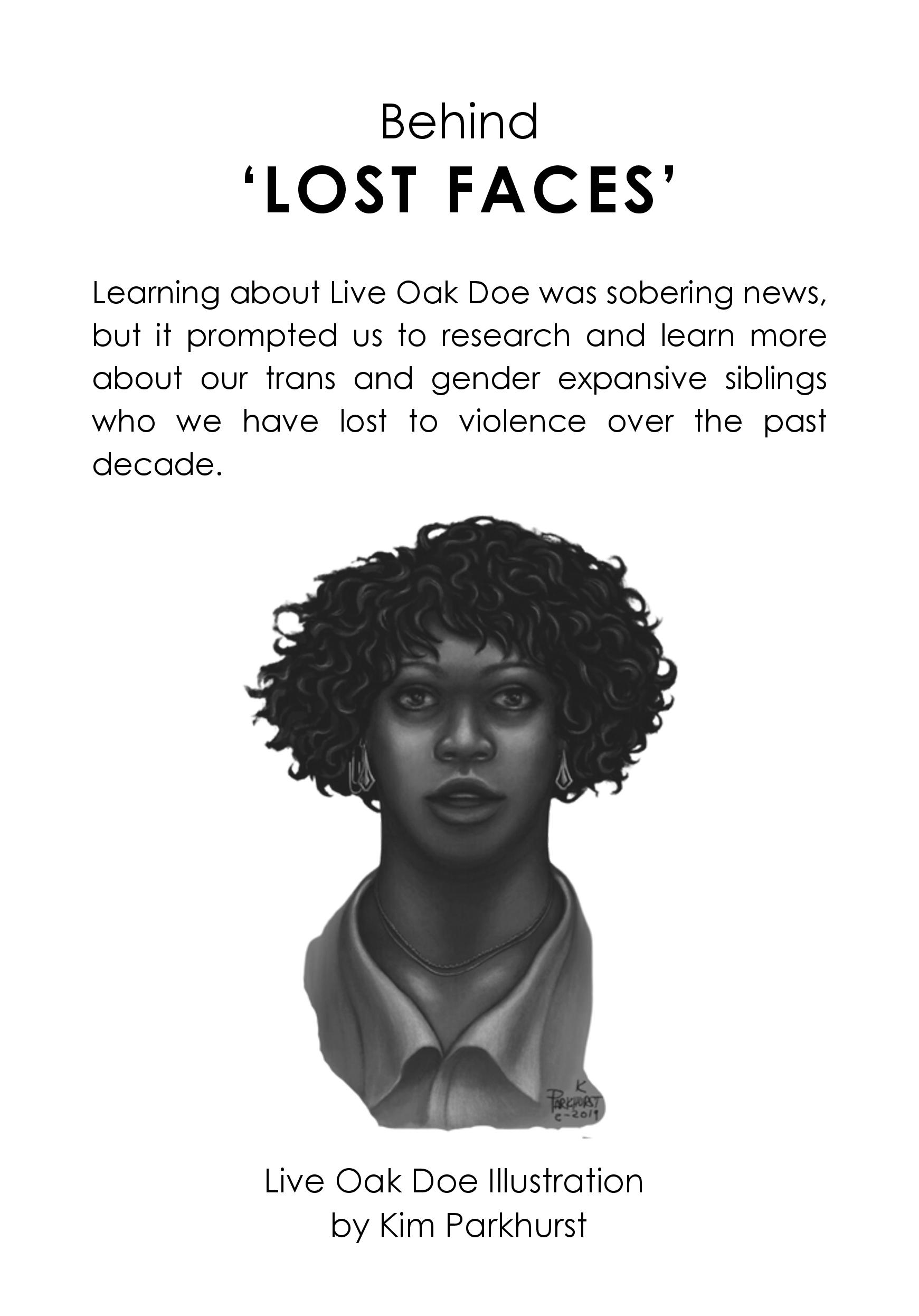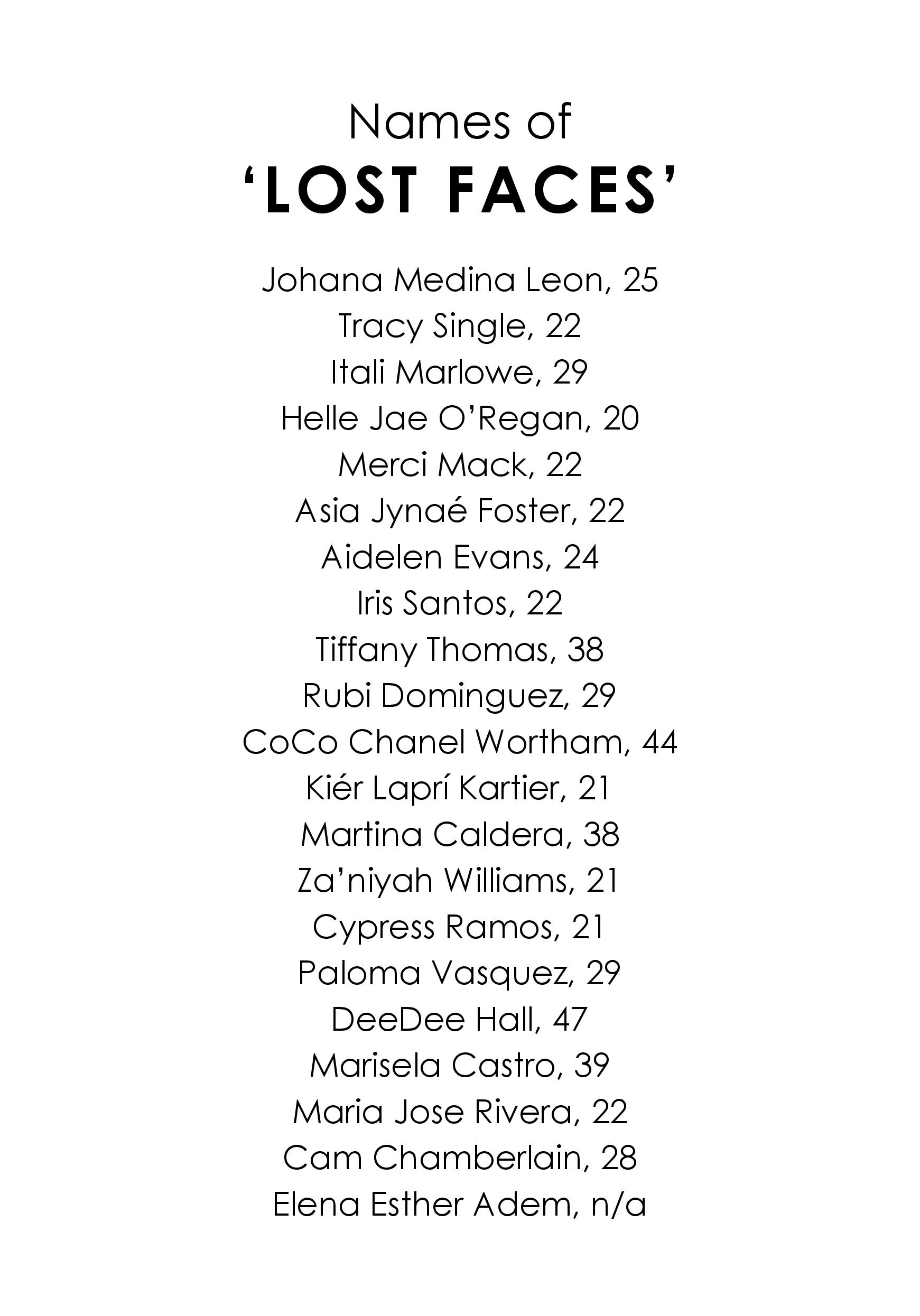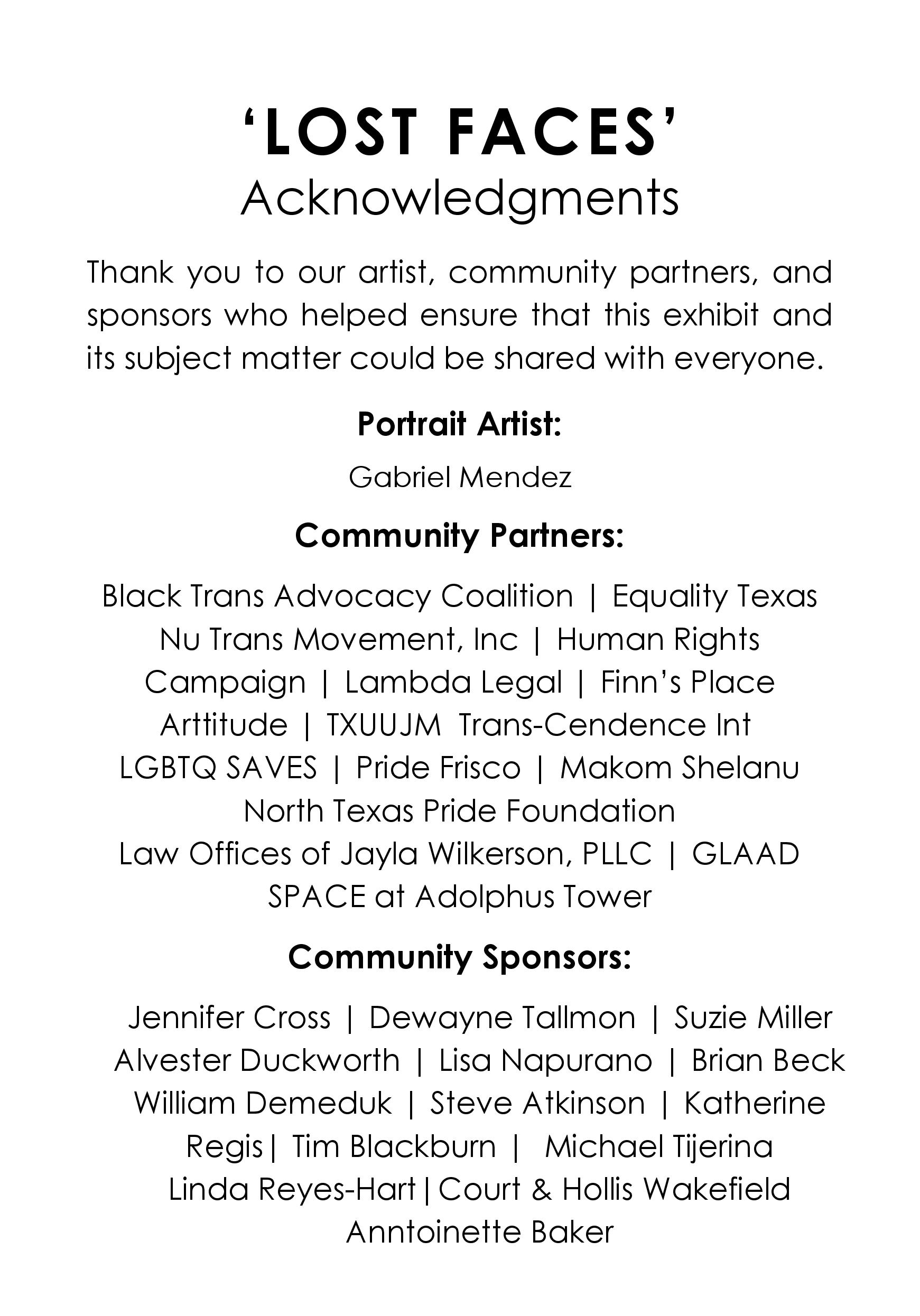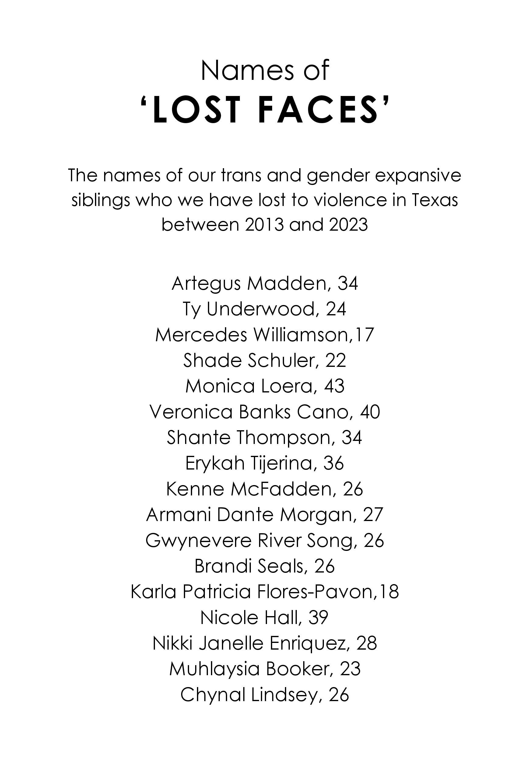 'Lost Faces: Trans Day of Remembrance Exhibition & Vigil' is an exhibit honoring the trans and gender expansive Texans that we have lost to anti-trans violence over the past decade.
