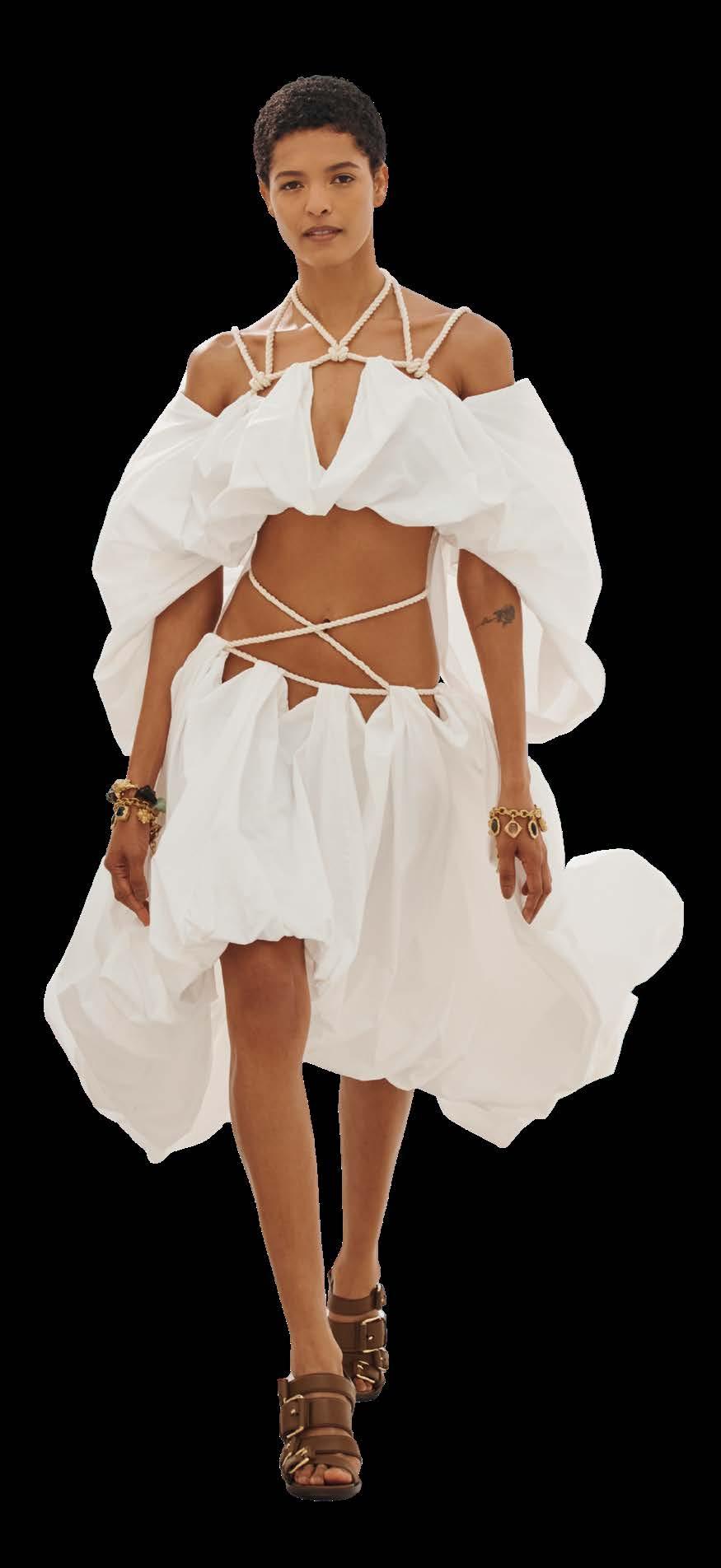 Los volúmenes florales y tejidos como la organza Jacquard, el encaje elástico bordado y el tul con lentejuelas aportan feminidad y ligereza, evocando una gran sensación de libertad en la elegancia.