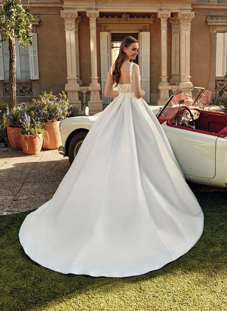 Cada diseño está pensado para transformarse, gracias a faldas superpuestas, mangas y colas desmontables que ofrecen múltiples opciones de estilismo, permitiendo a la novia reinventar su look a lo largo de la celebración. Los corsés de talle bajo, escotes drapeados y siluetas fluidas aportan una estética contemporánea que realza la belleza natural de cada mujer.