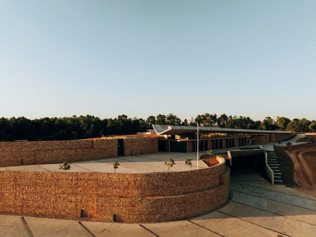 The newly opened Bodega La Horra is a powerful statement of commitment to landscape, sustainability, and excellence. It is also the first winery project designed by Carme Pinós, recipient of Spain’s National Architecture Prize. Drawing inspiration from the traditional underground cellars of the region, Pinós conceived a contemporary, semi-buried architectural piece, nestled into a hollow carved into the southern slope of the estate. This design harnesses natural geothermal energy while minimising visual impact. The structure is topped with a colossal slab of exposed concrete, which Pinós likens to a monumental spoon—symbolically used to “scoop out” the earth to make way for the building. The surface of this inverted slab follows the contours of the land and will become a spontaneous garden of native flora. Alongside gabion stone walls, this garden underscores one of the project’s central themes: harmonious integration with the landscape.
