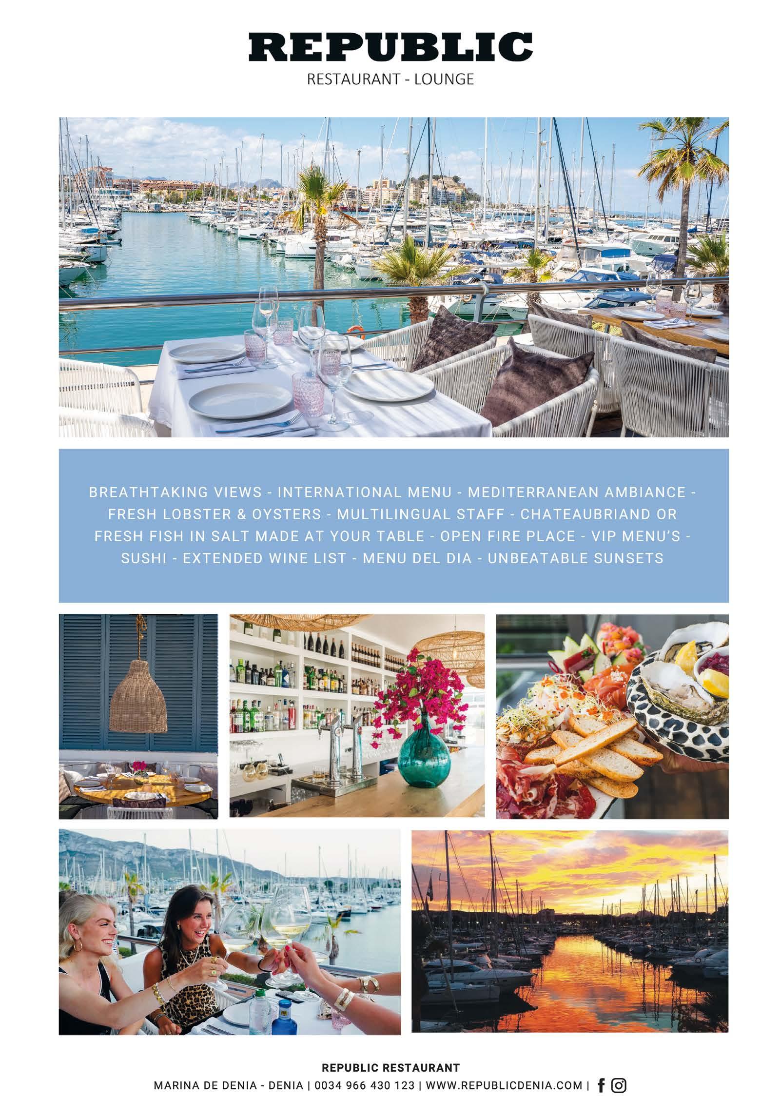Republic is a restaurant serving highquality international cuisine, open 365 days a year. Thanks to its prime location in the Dénia Marina and its all-day kitchen, you can enjoy lunch and dinner, as well as an afternoon sip of wine and cocktails with exceptional views. On cold winter nights, the fireplace always guarantees the best atmosphere..