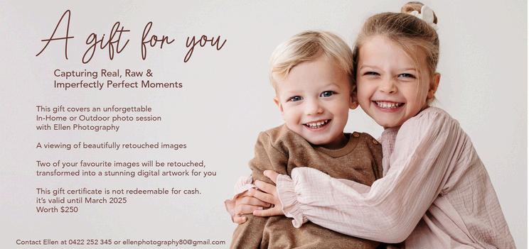 This gift covers an unforgettable in-Home or outdoor photo session with Ellen Photography.