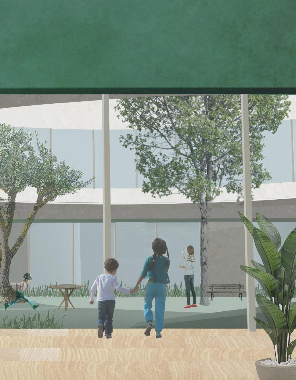 A big focus in this project was integrating the existing topography into the design of the building. The site featured a steep slope on the North and East ends. Instead of ignore this change in topography and simply flatten the site, I decided to rework the site and sink the building into the landscape. This choice provided many advantages - underground parking, more control over apertures and lighting, and increased environmental connection for students and staff.