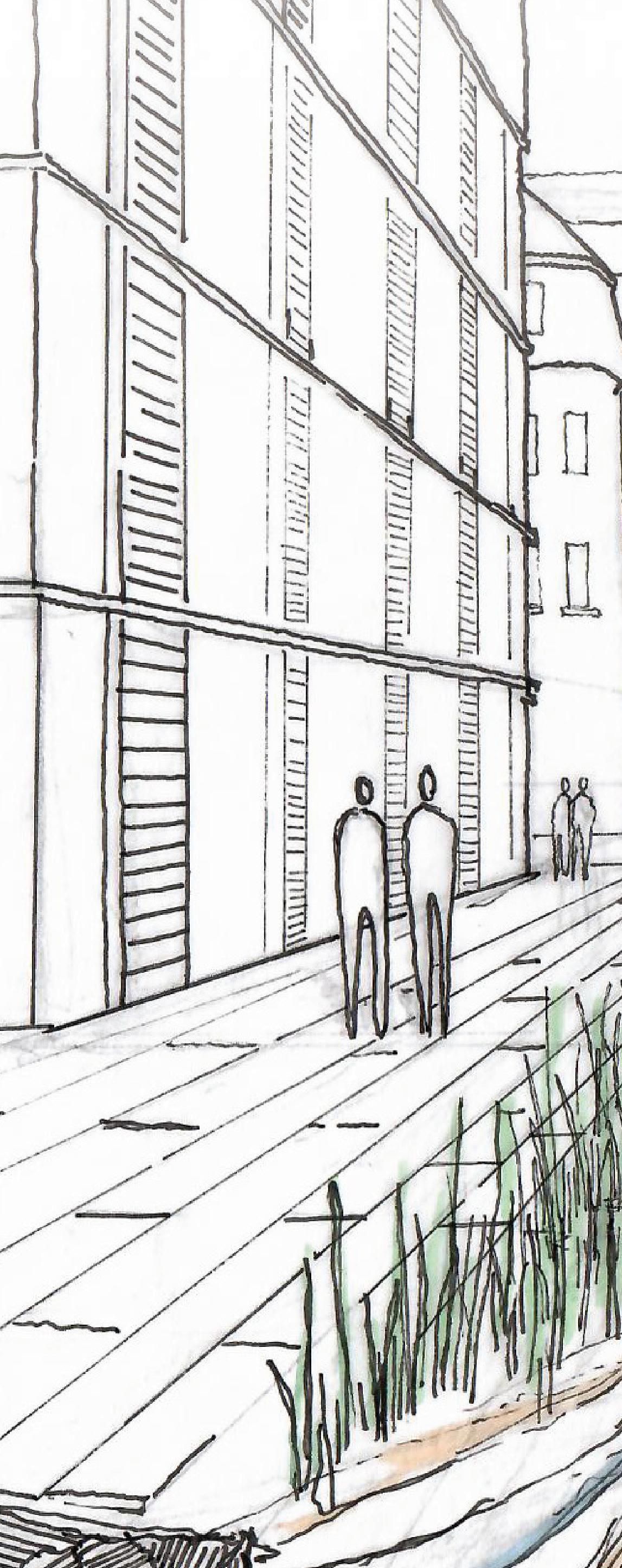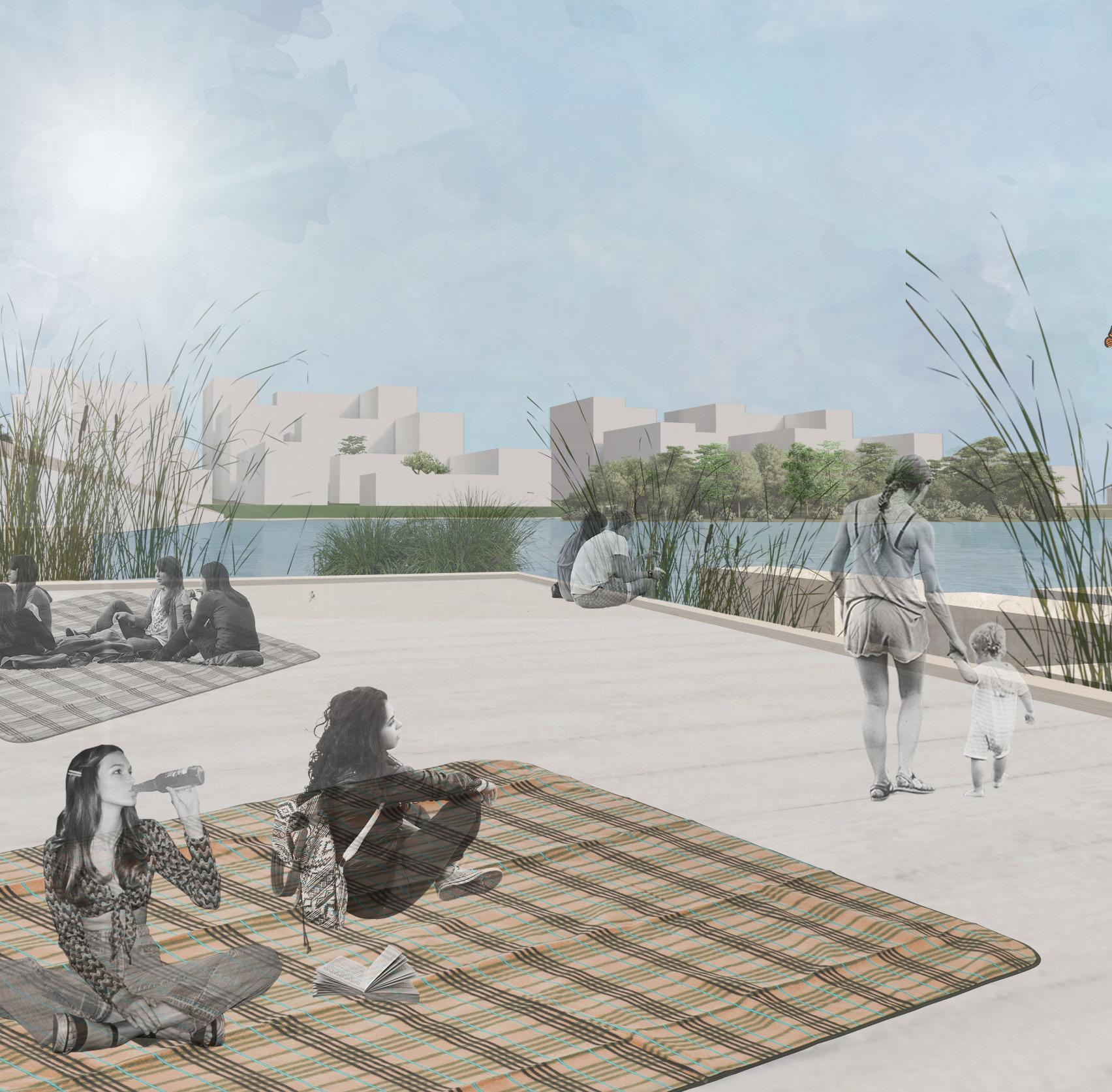 Along with the lake, we wanted to prioritize placemaking for the residents of the proposed eco-district. We created a large lateral park bordering the lake, filled with marshland to provide natural habitats and stunning views. We presented our ideas through a series of experietial “vignettes,” detailed site diagrams, and a large-scale physical model.
