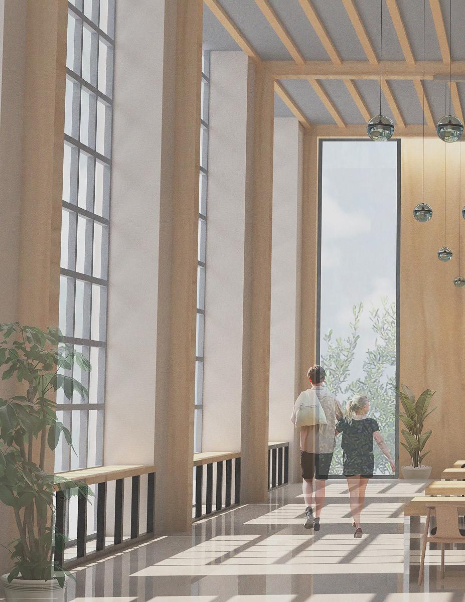 Overlooks are placed off the lateral plaza, creating space for relaxation and meditation. Residents are encouraged to enjoy views of the central lake.