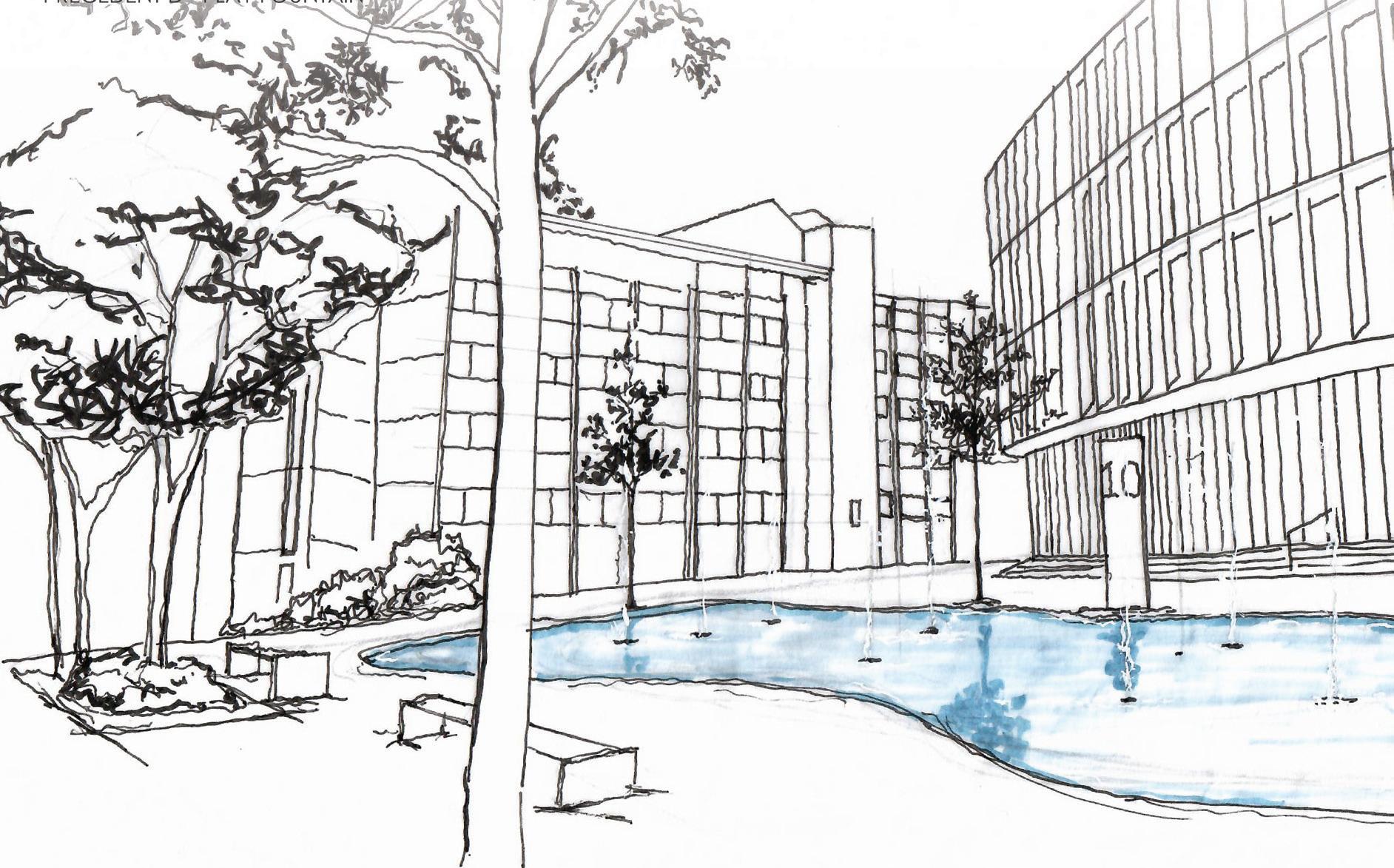 We challenged ourselves to create these blue features through hand drawn imagined conditions. Touring the campus, we discovered five areas in dire need of nature within hardscape.