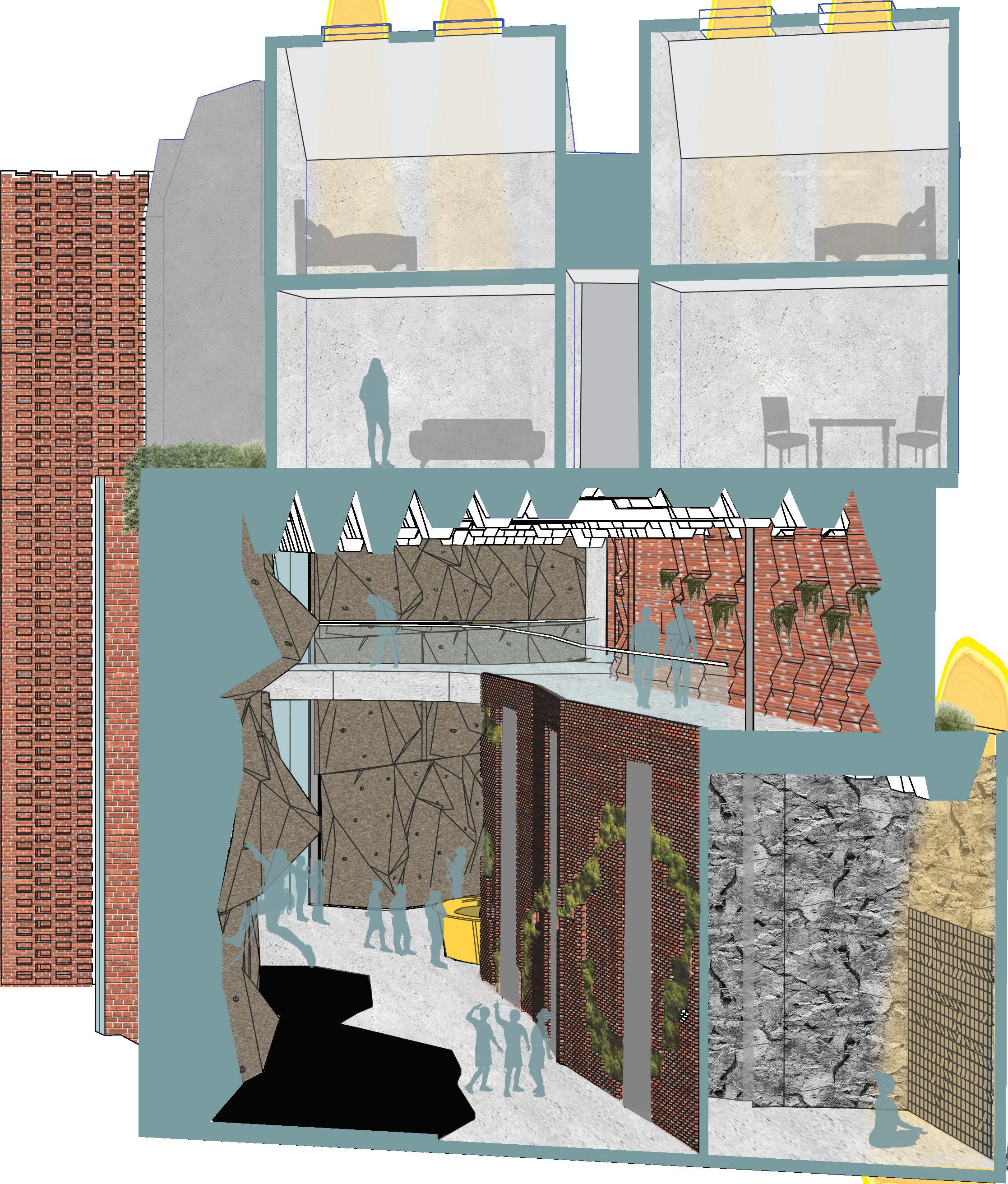 Section cut through back entrance to view rock climbing facility, meditative space, overlook, and apartments