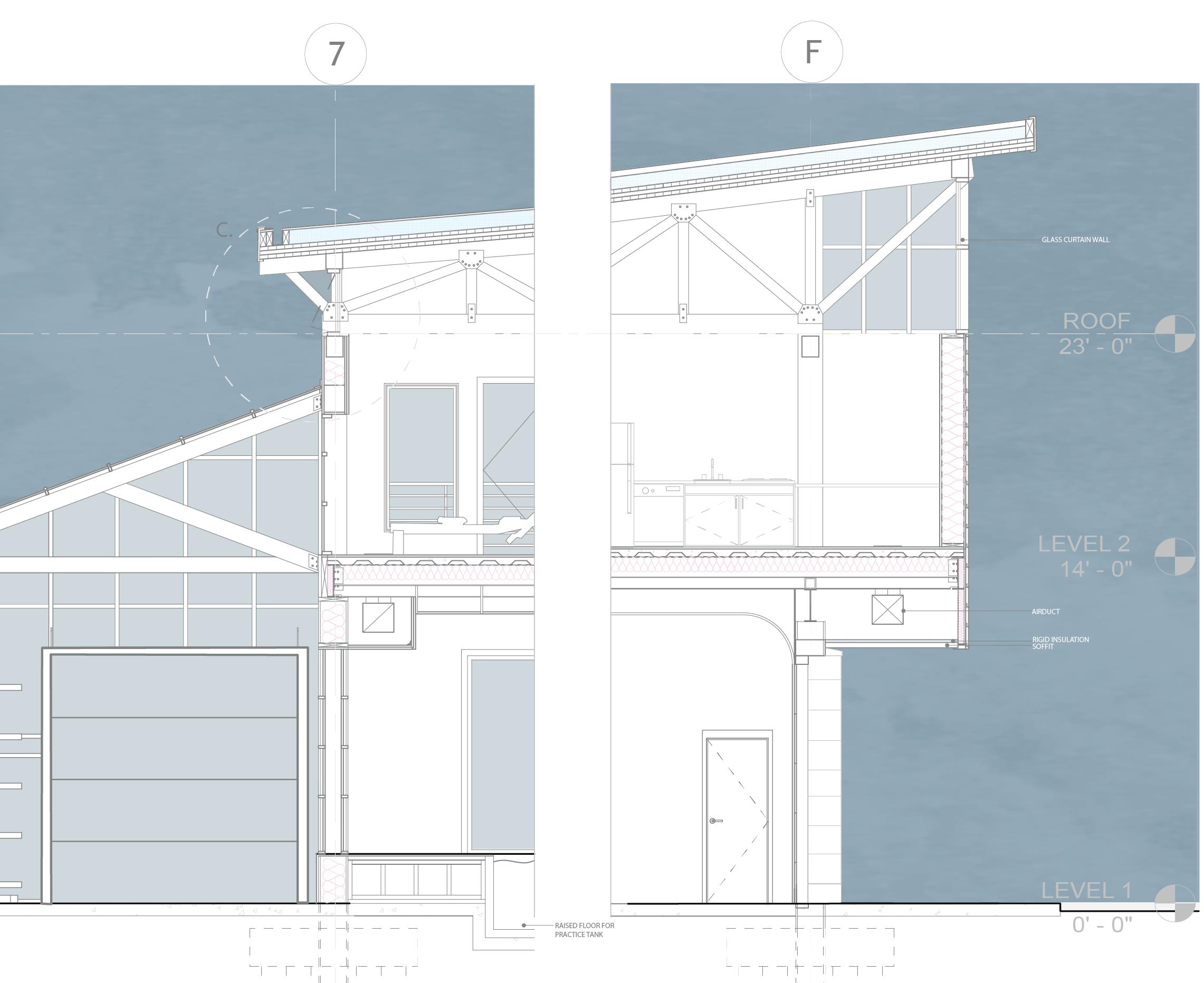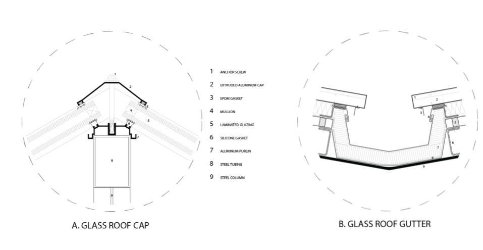 ABOVE: Detail drawings for the roof assembly BELOW: Section detail with callouts for materiality