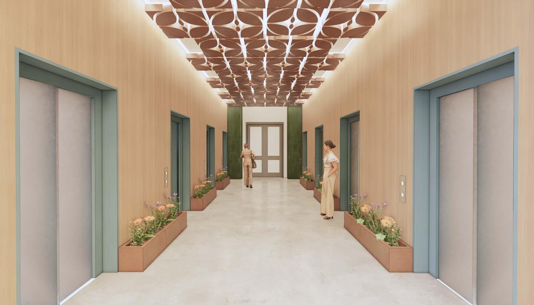 final motif pattern used for ceiling element in garden room + elevator hallway