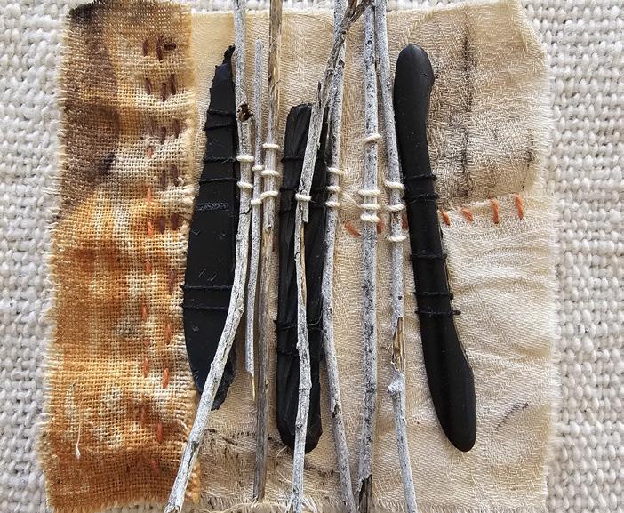 Today, I choose to notice. I look more closely at the people, places, and things that are overlooked and discarded. And so, this series unfolded. It began with a goal of walking 100 days and collecting the often unappreciated objects, both man-made and from nature, then creating hand-stitched 4x4 compositions in which the individual piece included at least one of each. The initial intent – to honor the rich, untold stories that lie within the found objects. Observing the artifacts side by side in each composition suggested the idea of juxtaposition and the title for the series was realized.