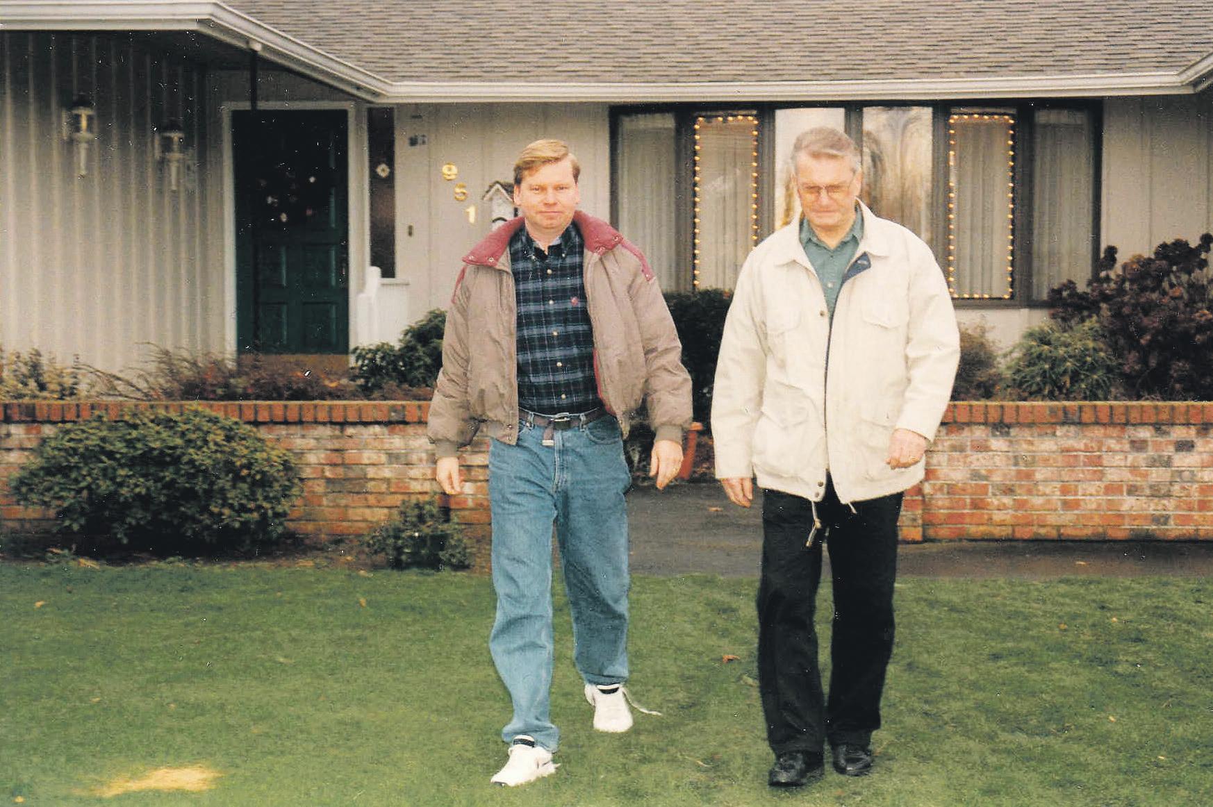 In October 1998 Dale Kaemingk, left, donated a kidney to his father, Jim Sr., ex-mayor of Lynden, who was dealing with kidney failure. This pho tograph was taken when the two were together at Christmas in 1998. (Lynden Tribune file photo)