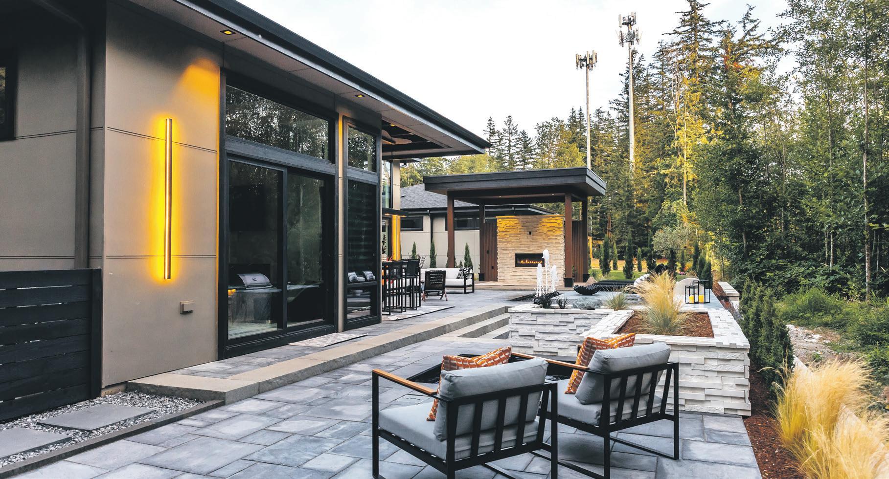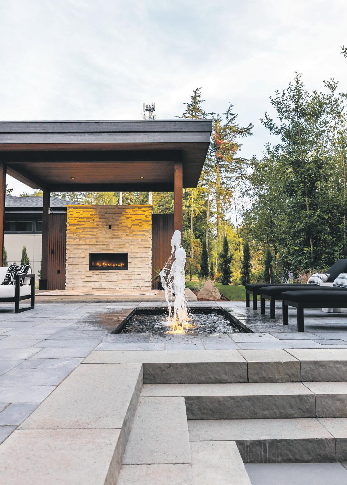 McClellan worked with Andrew Ziegenfus of Premier Landscape Co. of Whatcom County, which specializes in outdoor living spaces as well as paver patios and hardscapes, irrigation systems, landscape lighting, retaining walls, pools and spas. The central multi-spouted bubbling fountain, designed by Premier Backyard Living of Oregon, is shut down at night. This com-