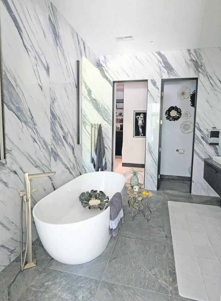 The master bedroom suite on the first floor has the feel of a high-end hotel room, but with views of the patio. Attached is a large master bath, divided into separate spaces, encased in marble with a large free-standing tub, an open shower, double sinks, and his-and-hers closet spaces designed by California Closets. A portrait of Marilyn Monroe guards the entrance.