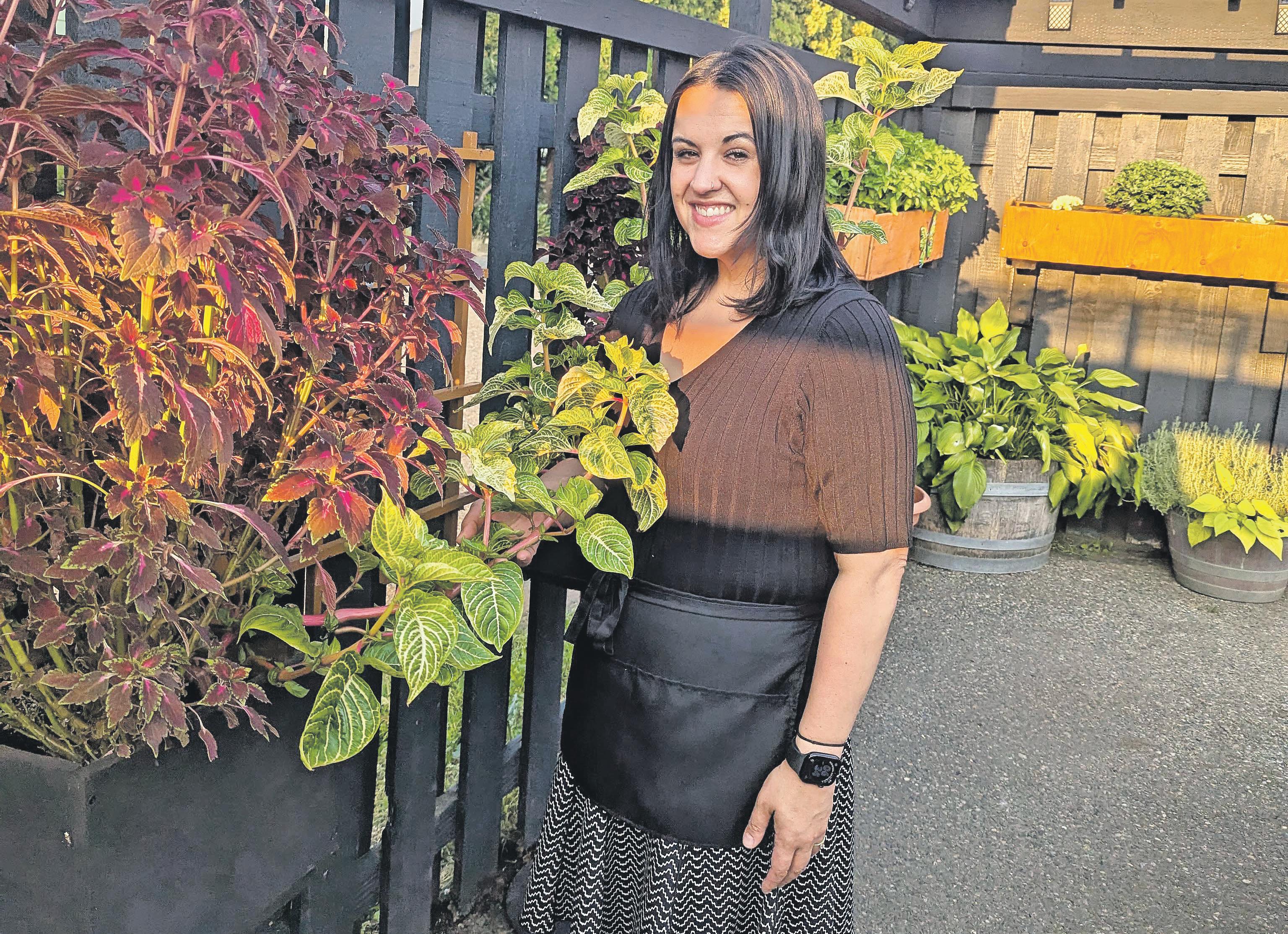 Kelsey de Medeiros stands at her container garden at the Bourbon restaurant in Everson. The restaurant uses containers at the front, side and behind the restaurant to grow both flowers and herbs. (Elisa Claassen for the Tribune)