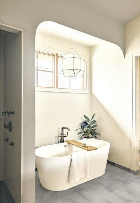 e outcome was this symmetrical and economical 1,800 square-foot home with three bedrooms and 2.5 baths. e stacked design and minimal undulations in the envelope helped make the most use out of every inch and get the best cost per square foot. Very e cient and intentional with space, the design is a proportionate house with stacked rst and second oors and the primary bedroom on the rst oor. e second oor will serve as a great space to host guests or visiting family and has a porch view overlooking the state park. e homeowners put in a lot of thought and intention into their selections. ey chose budget-friendly nishes that still had great quality, selecting from brands like Moen, Kohler, Bosch, LG and Frigidaire. To reduce the lighting xture costs, the clients opted for mostly can lights.
