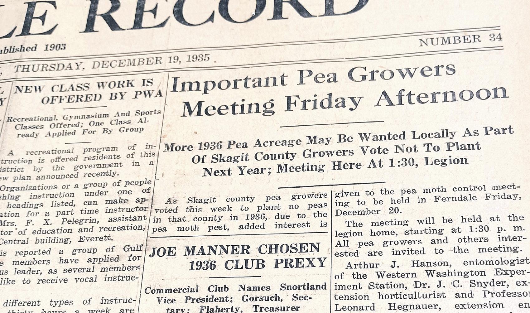 to plant no peas in that county in 1936, due to the pea moth pest, added interest is given to the pea both control meeting to be held in Ferndale Friday, Dec. 20.
