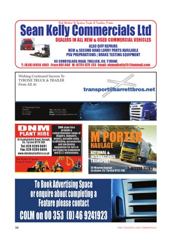 Sean Kelly Commercials Ltd DEALERS IN ALL NEW & USED COMMERCIAL VEHICLES ALSO DIFF REPAIRS NEW & SECOND HAND LORRY PARTS AVAILABLE PSV PREPARATIONS | BRAKE TESTING EQUIPMENT 93 CORRYGLASS ROAD, TRILLICK, CO. TYRONE T: (028) 8956 1403 From ROI 048 M: 07751 675 133 Email: shanejkelly25@hotmail.com Wishing Continued Success To TYRONE TRUCK & TRAILER From All At