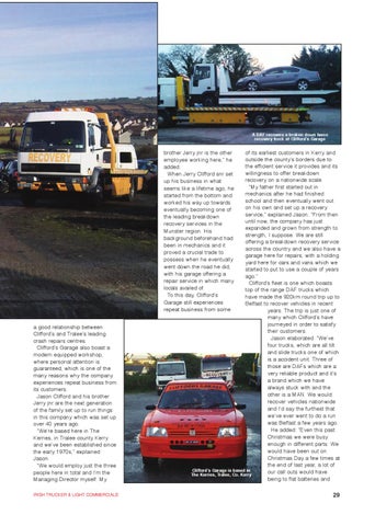 brother Jerry jnr is the other employee working here,” he added. When Jerry Clifford snr set up his business in what seems like a lifetime ago, he started from the bottom and worked his way up towards eventually becoming one of the leading breakdown recovery services in the Munster region. His background beforehand had been in mechanics and it proved a crucial trade to possess when he eventually went down the road he did, with his garage offering a repair service in which many locals availed of. To this day, Clifford’s Garage still experiences repeat business from some a good relationship between Clifford’s and Tralee’s leading crash repairs centres. Clifford’s Garage also boast a modern equipped workshop, where personal attention is guaranteed, which is one of the many reasons why the company experiences repeat business from its customers. Jason Clifford and his brother Jerry jnr are the next generation of the family set up to run things in this company which was set up over 40 years ago. “We’re based here in The Kerries, in Tralee county Kerry and we’ve been established since the early 1970s,” explained Jason. “We would employ just the three people here in total and I’m the Managing Director myself. My IRISH TRUCKER & LIGHT COMMERCIALS