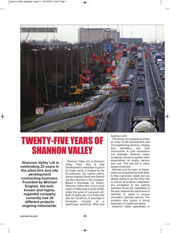 Shannon Valley Ltd is celebrating 25 years in the plant hire and site development contracting business. Founded by Michael English, the wellknown and highlyregarded company currently has 30 different projects ongoing nationwide. BUILDING IRELAND