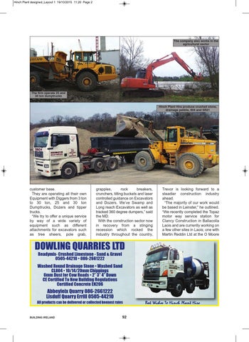 grapples, rock breakers, crunchers, tilting buckets and laser controlled guidance on Excavators and Dozers. We’ve Swamp and Long reach Excavators as well as tracked 360 degree dumpers,” said the MD. With the construction sector now in recovery from a stinging recession which rocked the industry throughout the country,
