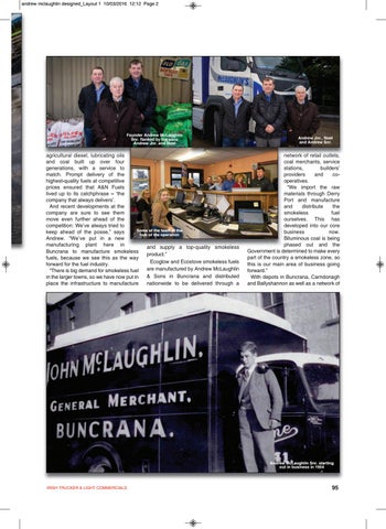 network of retail outlets, coal merchants, service stations, builders’ providers and cooperatives. “We import the raw materials through Derry Port and manufacture and distribute the smokeless fuel ourselves. This has developed into our core business now. Bituminous coal is being phased out and the Government is determined to make every part of the country a smokeless zone, so this is our main area of business going forward.” With depots in Buncrana, Carndonagh and Ballyshannon as well as a network of