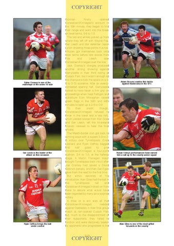 Gorman finally opened Coralstown/Kinnegad’s account in the 19th minute, they began to find their range and went into the break on level terms, 0-6 to 1-3. The red and whites picked up from where they left off with Wayne Fox, Ger Leech and star defender Jason Lynch shooting three points in-a-row. Killucan got themselves back onto level terms before late scores from Fox and Leech saw Corlastown/Kinnegad over the line. Jack Cooney’s charges produced another strong showing against Garrycastle in their third outing at Cusack Park, but it wasn’t enough as the champions took the spoils on a 29 to 0-13 scoreline. After an evenlycontested opening half, Garrycastle looked to have taken a firm grip on proceedings when Neal Rattigan and substitute Eoin Monaghan raised green flags in the 36th and 46th minutes to open up a 2-8 to 0-9. To their credit, though, Coralstown/Kinnegad refused to throw in the towel and a late rally, which yielded scores from Alan Giles and Ger Leech, left the All-Ireland finalists relieved to hear the final whistle. The Meath-border club got back to winning ways with a superb 3-8 to 28 victory over Tyrrellspass. Enda Leonard and Ryan Caffrey bagged first half goals to give Coralstown/Kinnegad a four-point cushion, 2-4 to 1-3, at the halfway stage. A Martin Flanagan major brought Tyrrellspass back into it after Joe Cronley had saved a David Glennon penalty, and then Ger Egan gave them the lead for the first time. But within seconds of his introduction, Alan Giles had the ball in the Tyrrellspass net and Coralstown/Kinnegad kicked on from there to secure what would have been regarded by many as a surprise victory. A draw or a win was all that Coralstown/Kinnegad needed against Castledaly in their final group match at rain-soaked Cusack Park but, much to the disappointment of their supporters, they failed to function and were decisively beaten by opponents who progressed to the