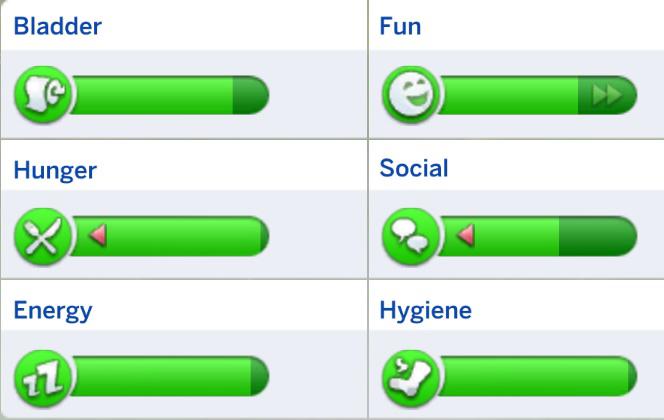 Taking care of a Sim's six basic needs (bathroom, hygiene, hunger, social, fun, and sleep) is essential to the game. Sims with low needs can have embarrassing accidents, be so miserable that they can't study or work, and can even die.