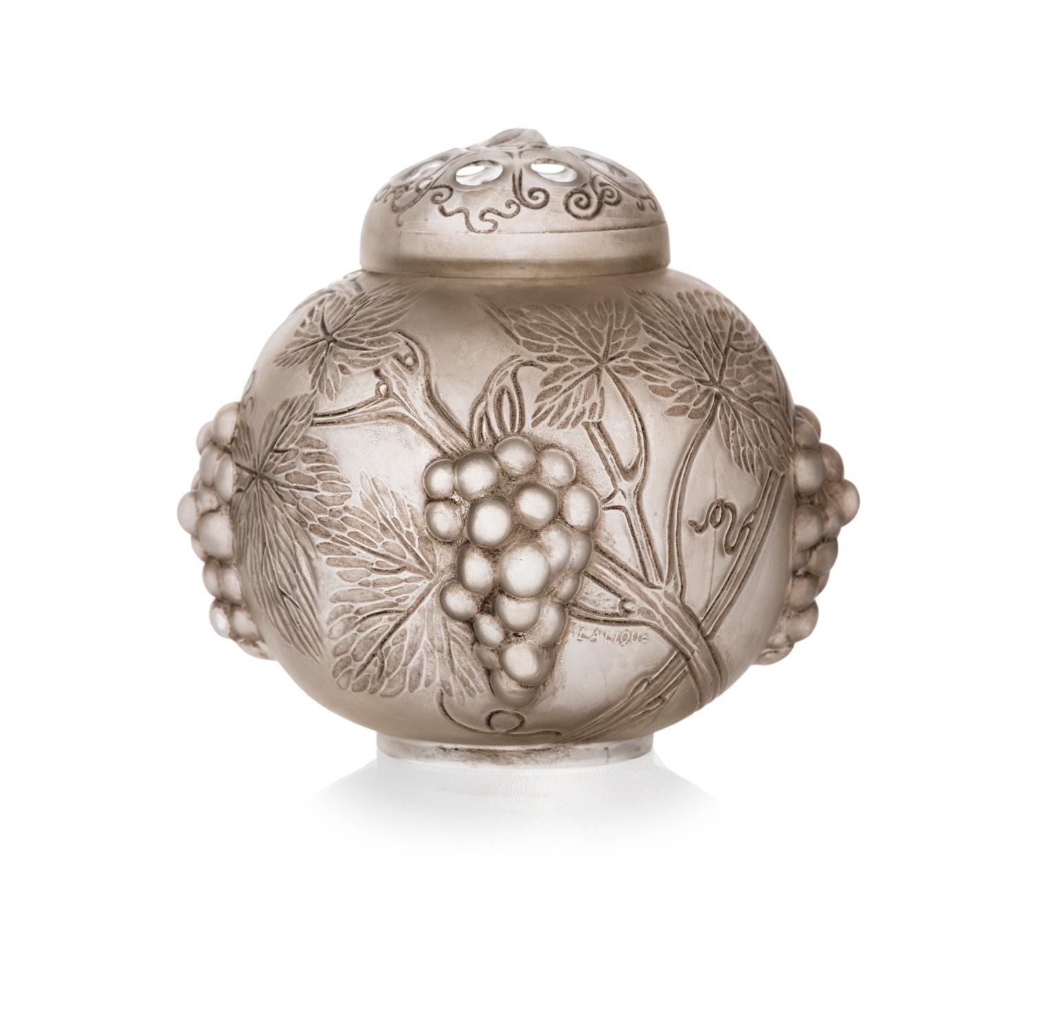 RENÉ LALIQUE (FRENCH 1860-1945) BOMBAY BOX, NO. 93 designed 1933 clear, frosted and grey stained stencilled R. LALIQUE FRANCE (2) 11.5cm (4 1/2in) high, 10.5cm (4 1/8in) diameter £2,000-3,000
