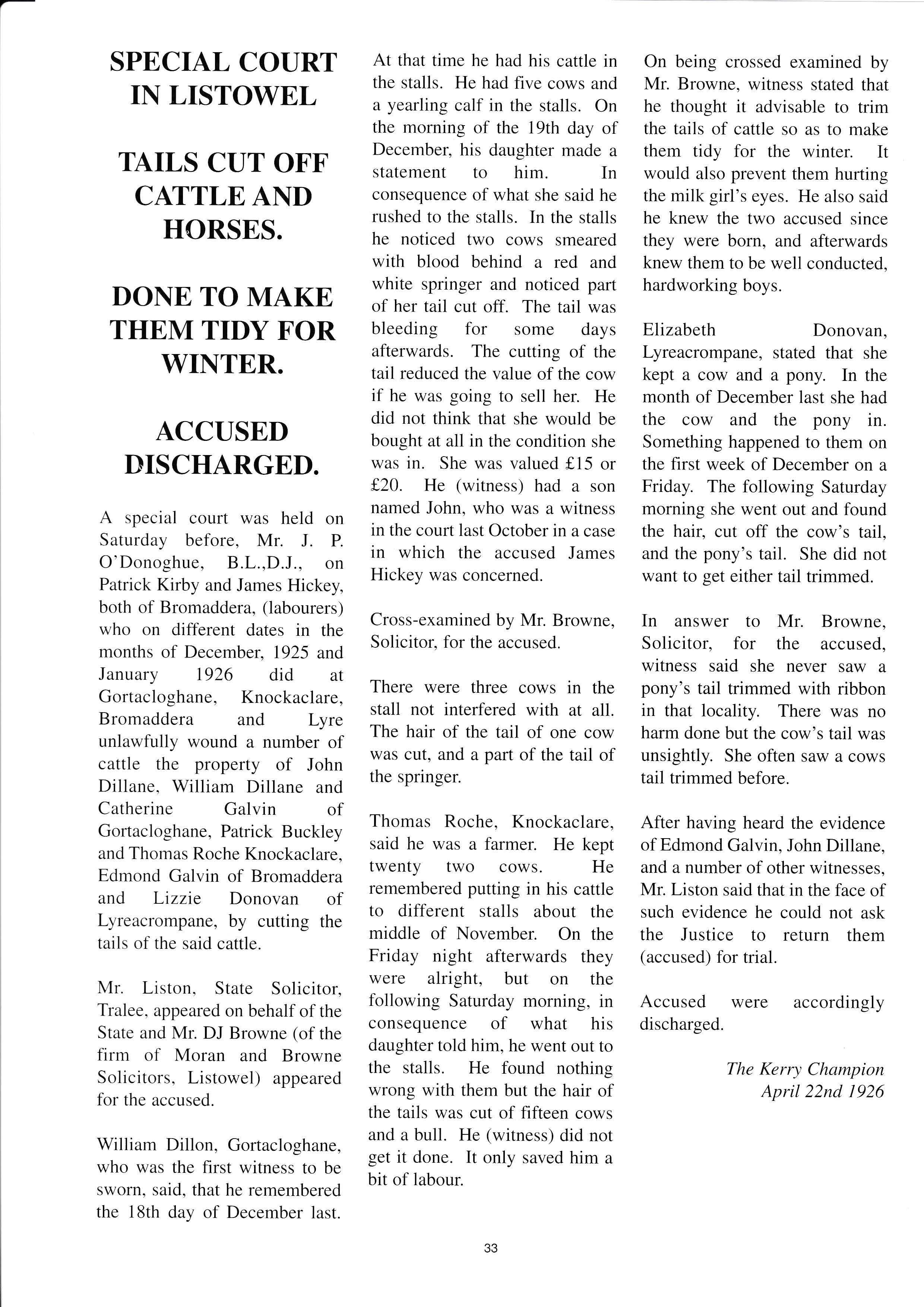 In the court case that followed, a witness named Bridie Kelleher confirmed Mary's evidence and Sgt Flynn also gave evidence. David O'Mahony represented himself and offered to show the Justice how to do the three card trick. The Justice refused the offer and ordered that the three cards be taken from O'Mahony. The Kerryman continues the story...