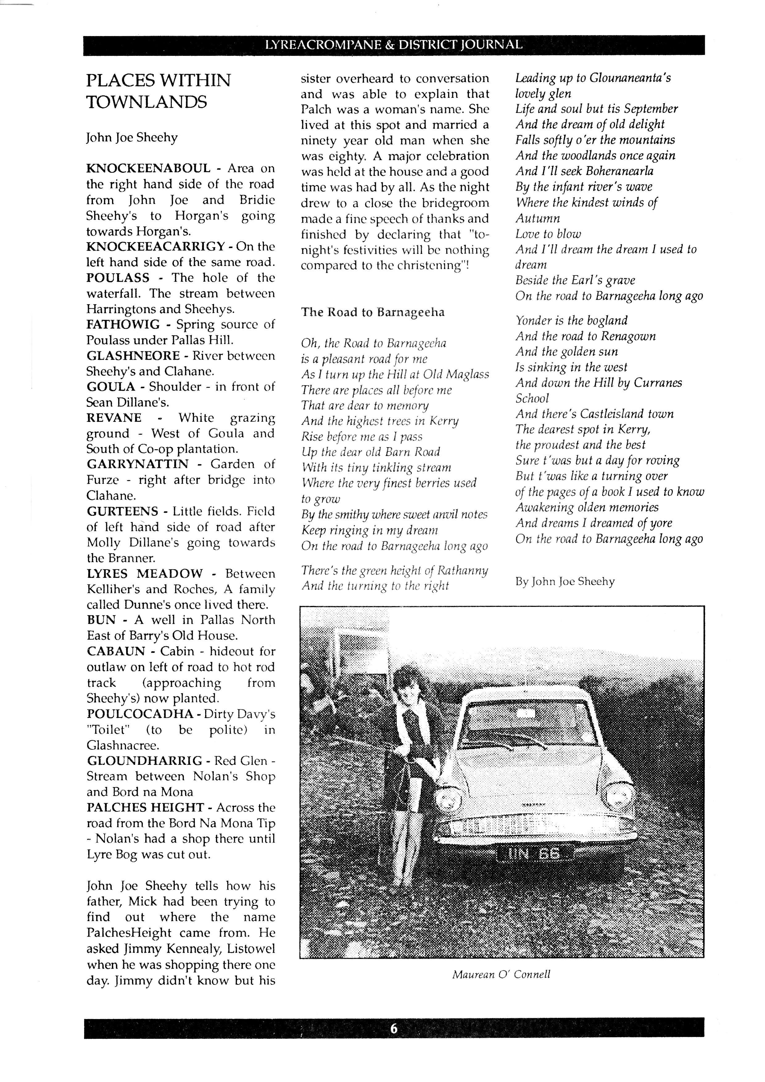 We wish to note with pleasure the many achievements in the Lyre area since the last issue of the Lyreacrompane and District Journal. Thanks to the work of the Development Association the area now Possesses a first class playing pitch in a beautiful setting on the banks of the Smearla. A Community Hall is in the planning Process and the water scheme is making progress through the locality. The Lyre walks have been further developed and a couple of local business initiatives are doing well. The work done towards a Development Plan for the area will ensure that further initiatives by the LyreacromPane community will be focused and co-ordinated to achieve the maximum benefit for the area. Finally, we were also saddened earlier this year by the death of one of the mainstays of our Journal, John Joe Sheehy. In this issue we pay a special tribute to the late John Joe in a feature devoted to more of his songs. verses and conversation.