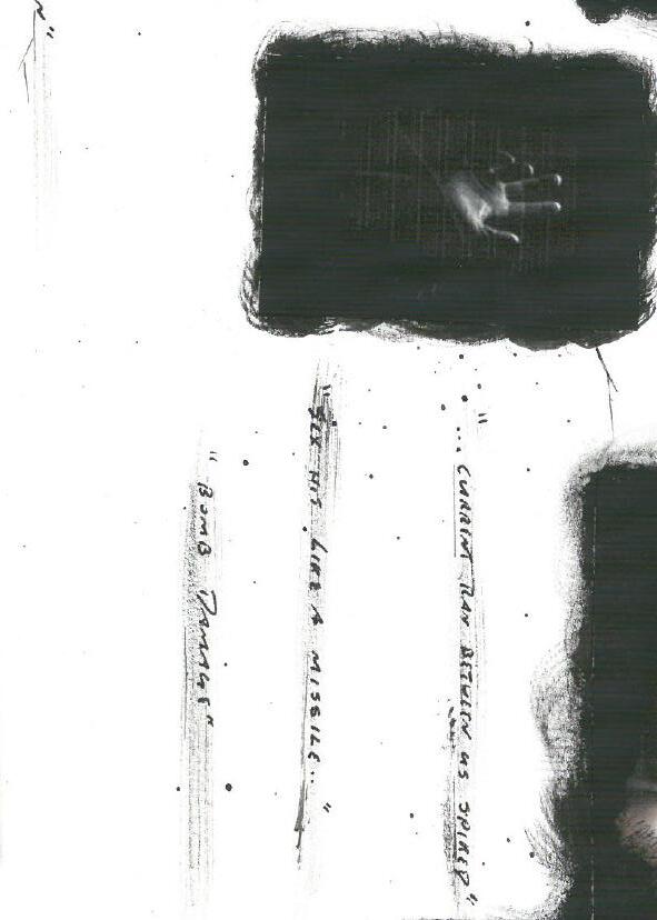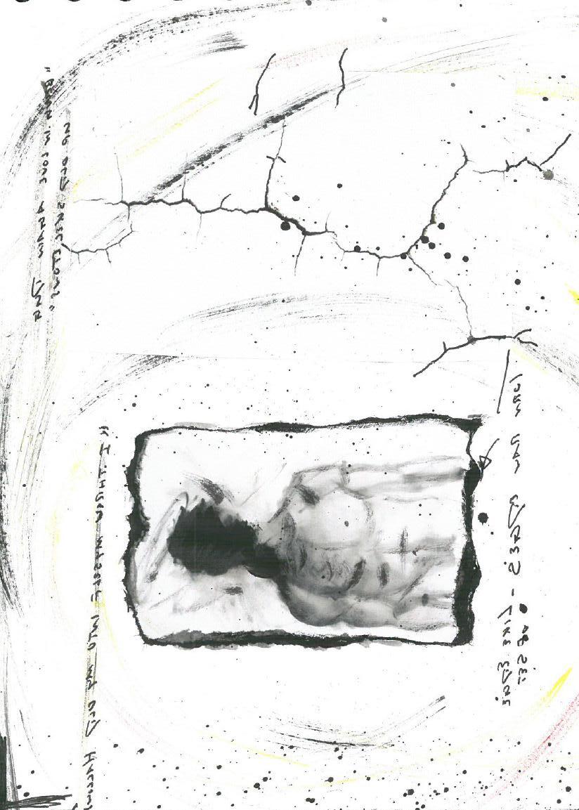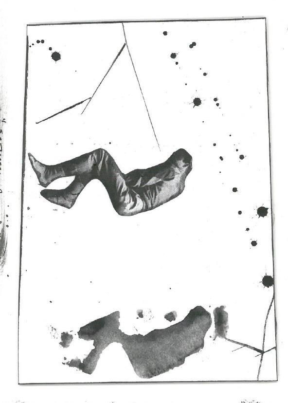 The artwork upon the set is responsive to the writing as well as the characters movement through the space. For the initial design I saw footprints on the surface, mapping the actions of Mark through the space as he goes between pubs. I saw the inkblot outline of “Himself” laying upon the floor as Mark lays beside him, the inkblot’s form only coming into focus once Mark was positioned alongside it.