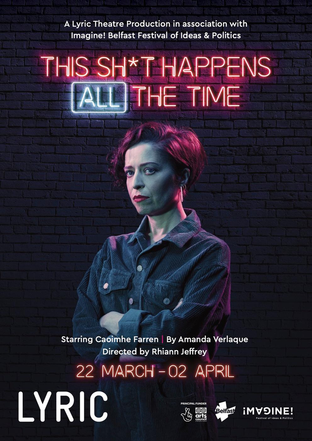âThe Lyricâs mission is to create, entertain and inspire, we are committed to delivering quality theatre from exceptional artists and especially new writing. We are very proud to produce Amanda Verlaqueâs 'This Shit Happens All The Time' in association with Imagine! Belfast Festival. Directed by Rhiann Jeffrey and starring Caoimhe Farren, this courageous new play offers audiences an emotional rollercoaster ride through a challenging love story that confronts us with our own accountability in defending the vulnerable against the forces of hateâ.