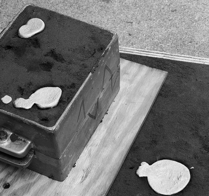 Sand-cast aluminum process using PetroBond sand molds and 3D printed forms. Sand is compacted around the positive until secure, then removed. Aluminum heated in a furnace is poured into the cavity. Images document this archaeology of making.