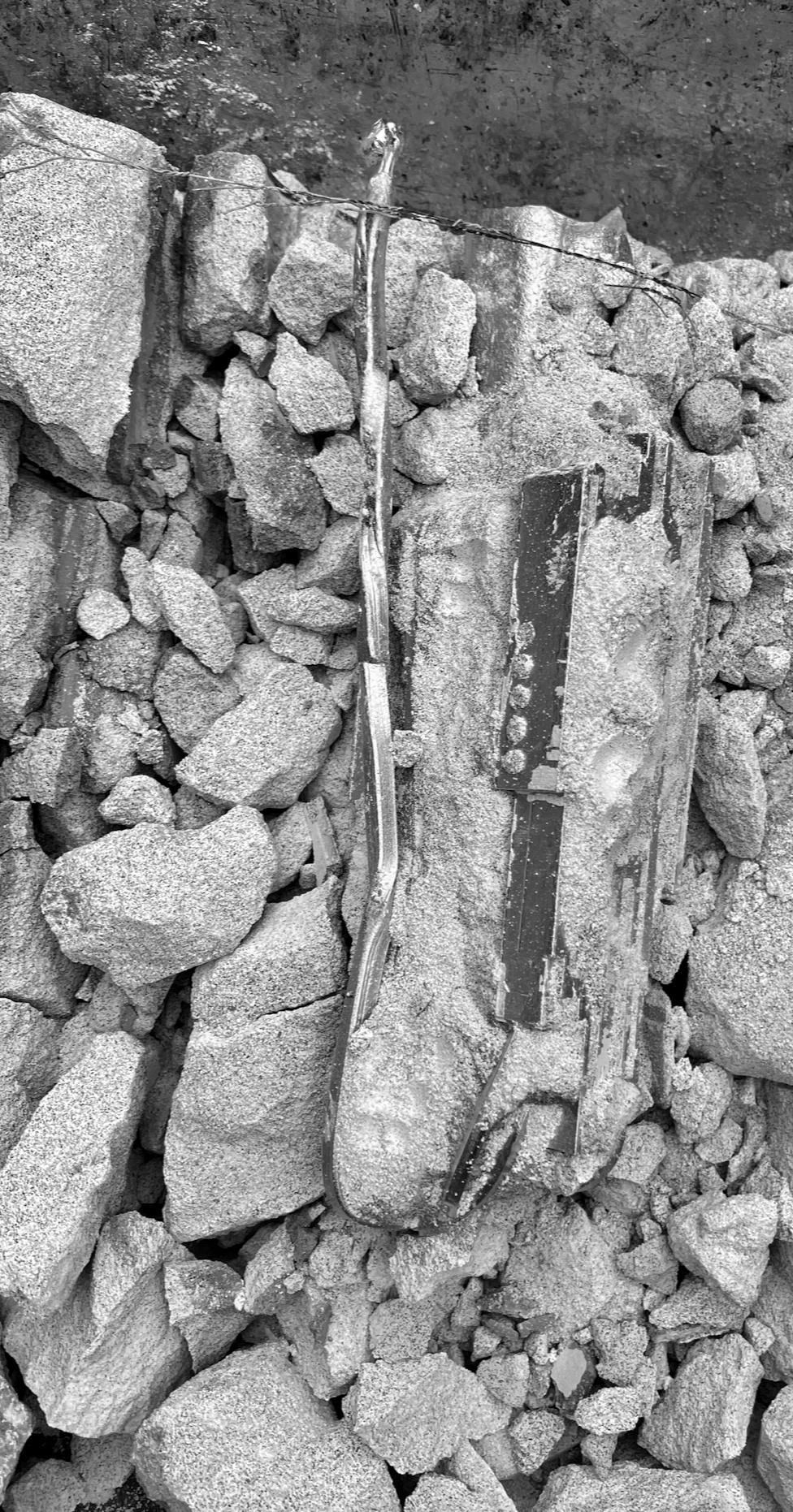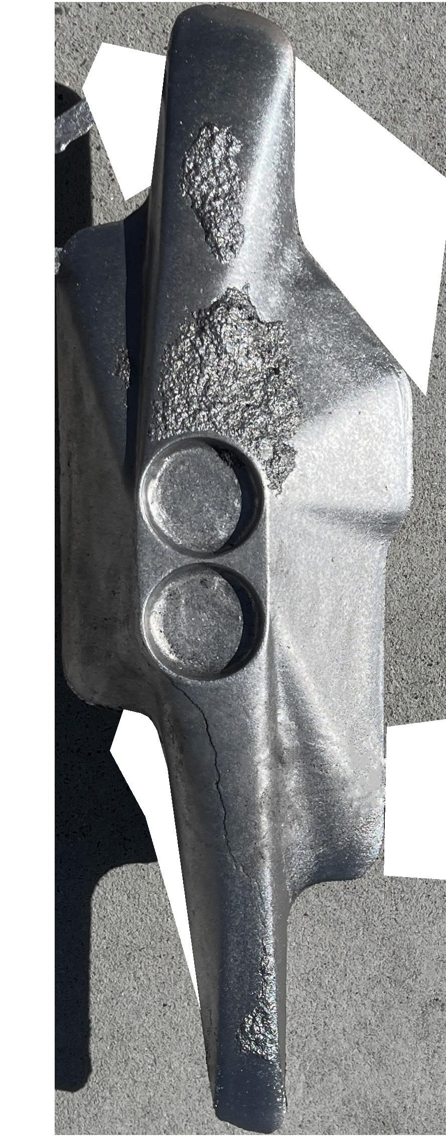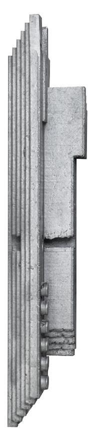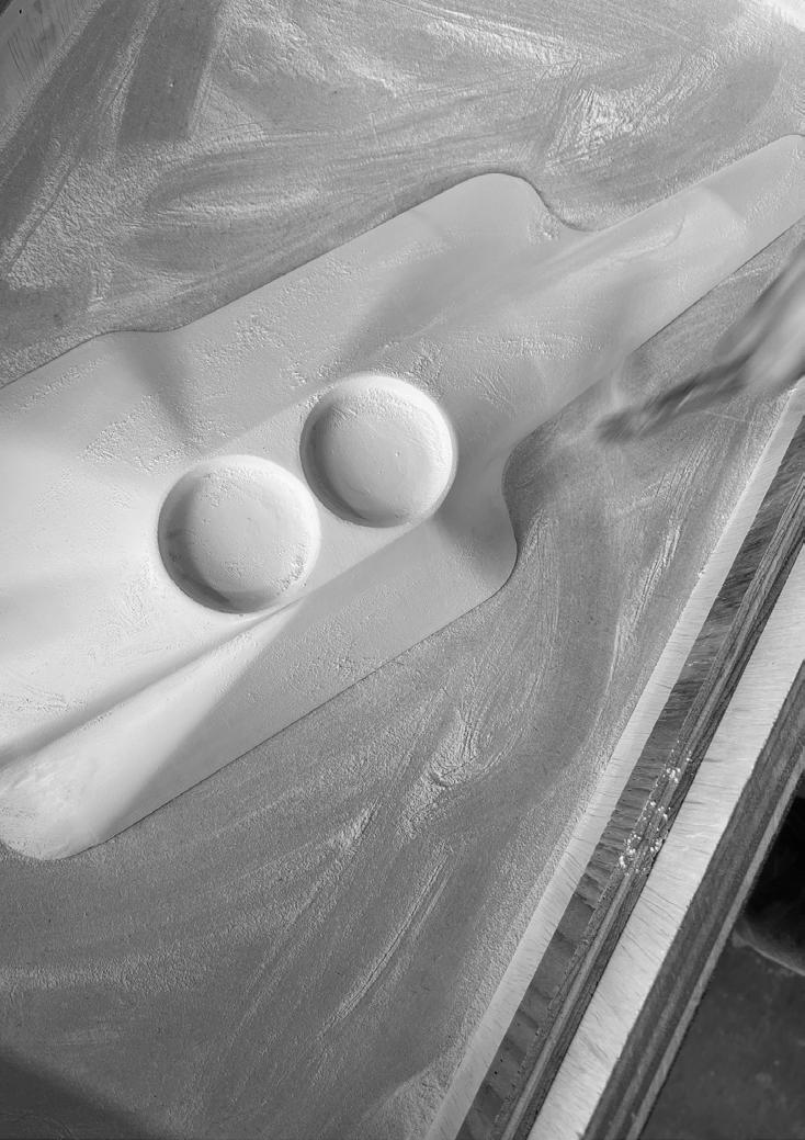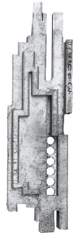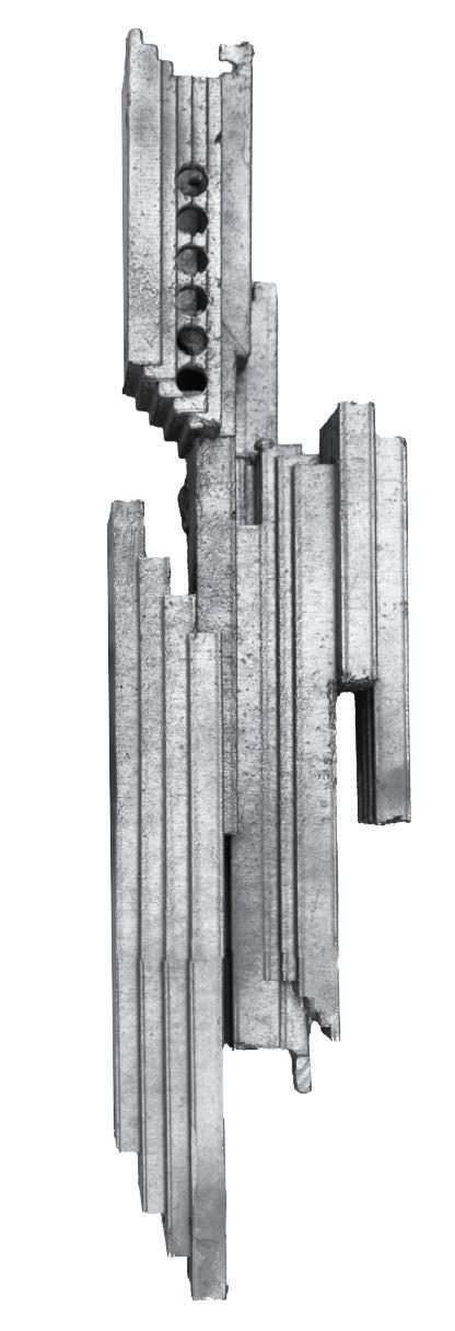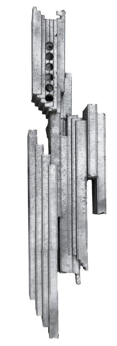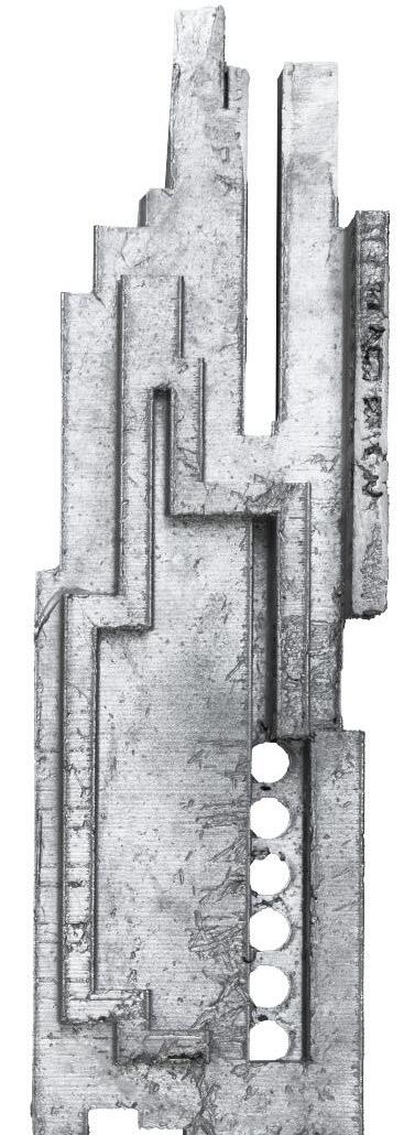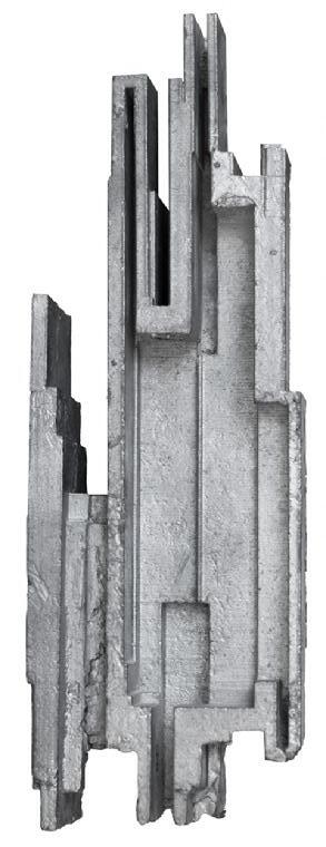 This aluminum model was constructed through lost-wax casting. A 3D printed positive and casting wax formed the pattern, which was submerged in plaster and burned in a kiln. Liquid aluminum poured into the void left after burnout. Once cooled, the plaster mold was broken away to reveal the final form. Images document the excavation process.