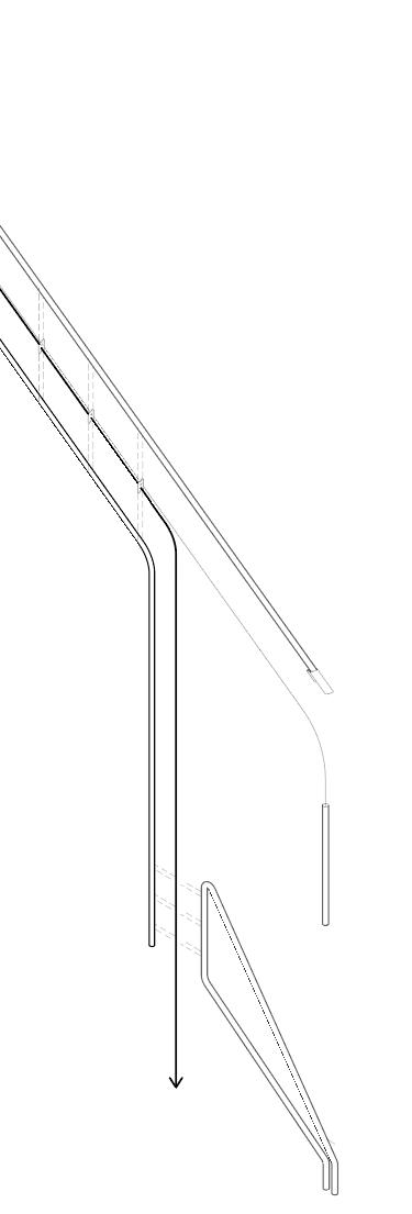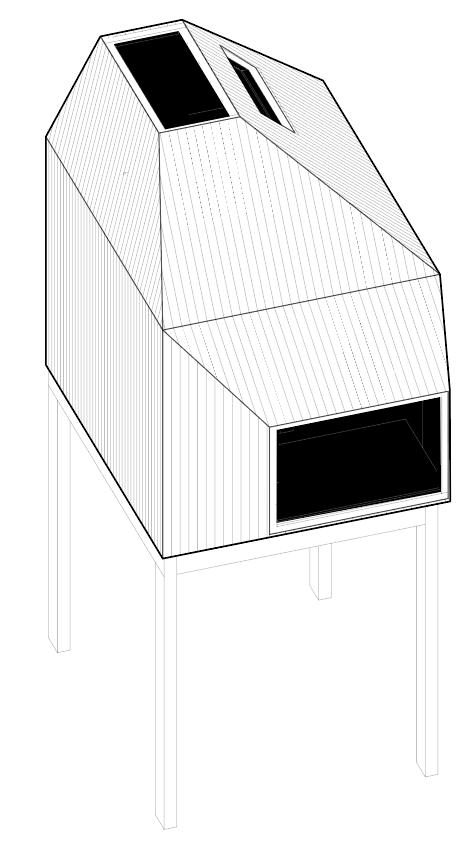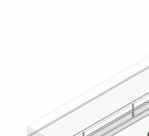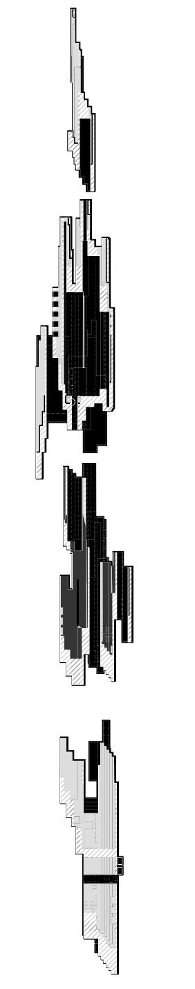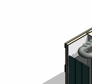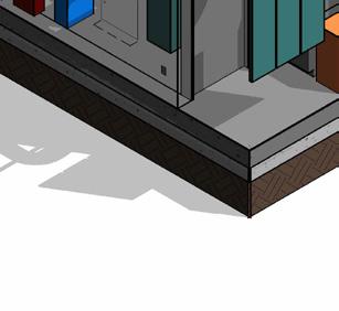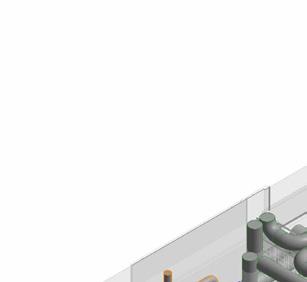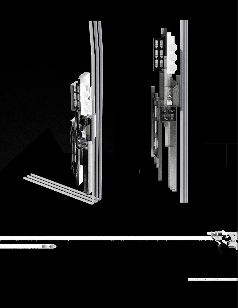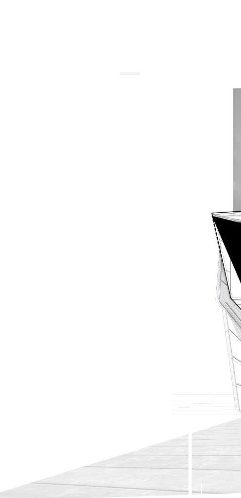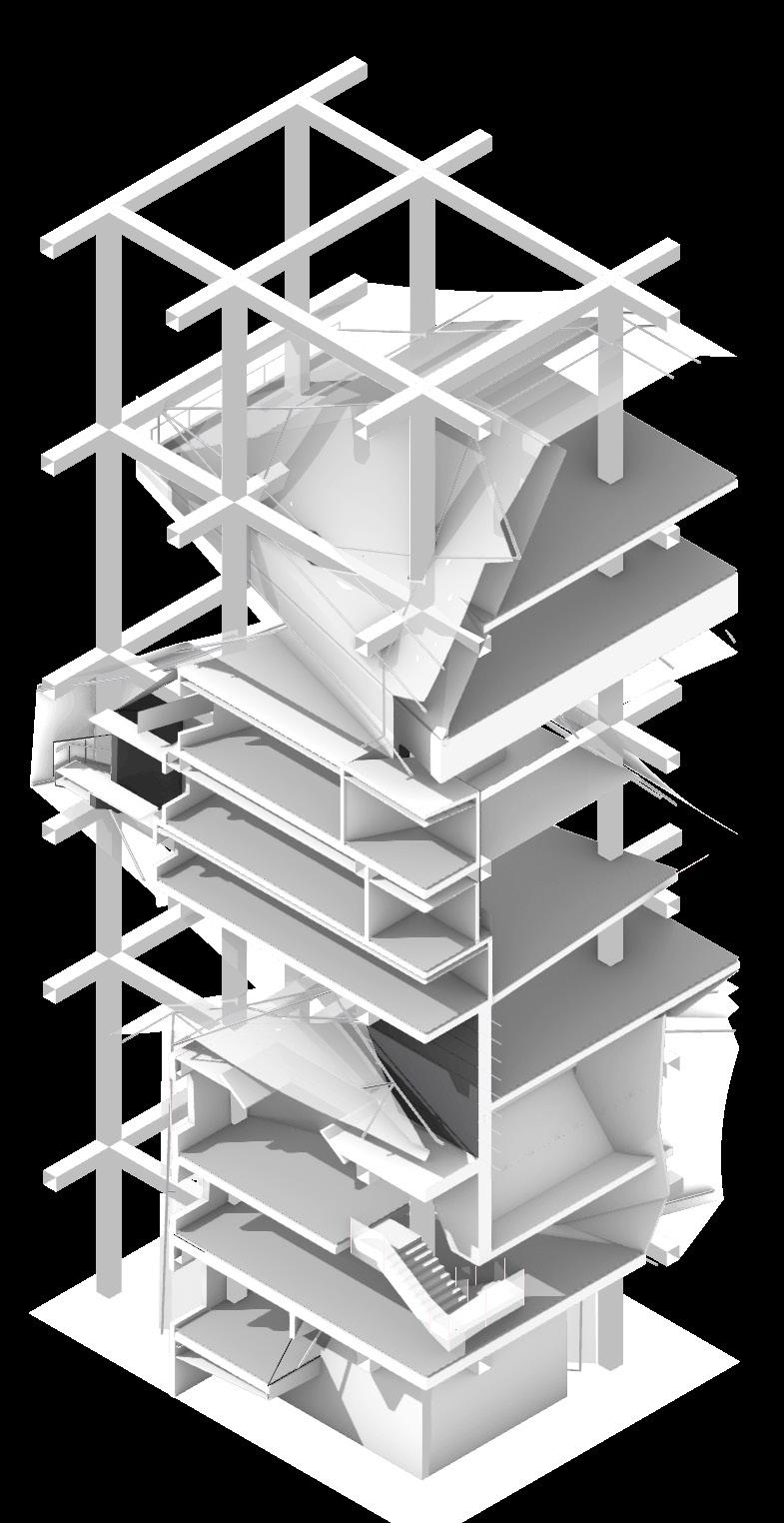 Mechanical Sweetness draws inspiration from surrounding industrial buildings, subverting practicality to create playful yet sustainable spaces. Slides twist around the structure, emulating mechanical systems while providing rapid descent. This logic extends to individual dorm units where efciency becomes inventive: kitchen and bathroom share a sink, desks fold to become sun shades. Function remains integral but multiplies through imaginative deployment, where single elements serve multiple purposes and circulation becomes play.