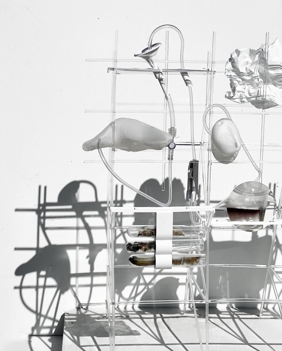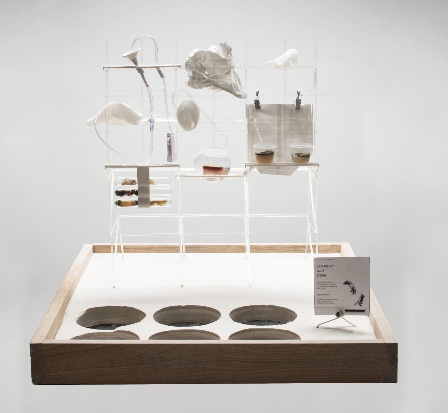 As the external environment has become increasingly shaped by humans, so too has our internal environment. The cage of our own design has infected the Western mind with the notion of an “individual,” leaving humans in a state of unbalanced solitude and no longer able to live without exploiting and destroying the delicate systems of the world around us. I chose to imagine a new framework for connection, in which biological knowledge of humans and non-humans is understood as a key infrastructural element in maintaining life. Fascinated by this act of co-becoming, I focused on designed encounters between microbes and humans, serving as facilitators for either reciprocity or reverence and bring forward a new multi-species conception of identity.