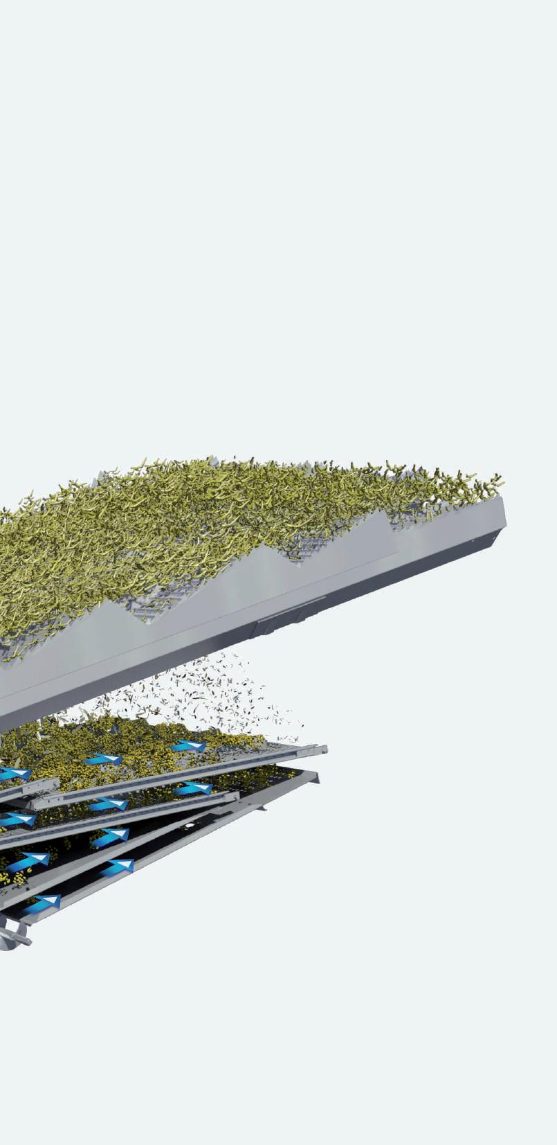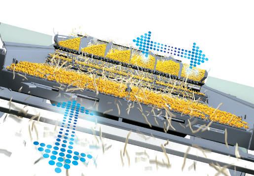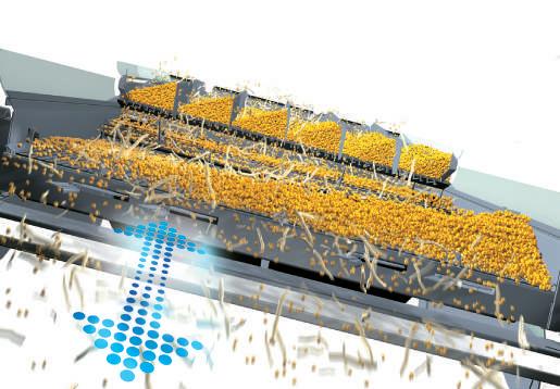 Tobulos kokybės derlius. Trijų pakopų kaskadinė valomoji turi 450 mm pasvirusį pradinį sietą. Nuo šios kaskados reguliuojamo ventiliatoriaus oro srautu nupučiami pelai ir trumpi šiaudai prieš grūdams patenkant ant viršutinio ir apatinio sietų. Rezultatas? Švaresnis grūdų mėginys.